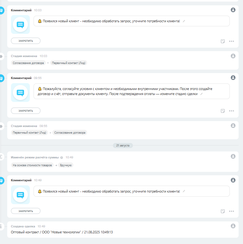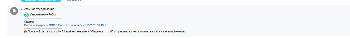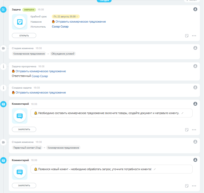 Задачи сотрудникамБлагодаря роботам задачи смогут сами назначаться в нужный отдел, тем самым автоматизируя процесс передачи сделки.