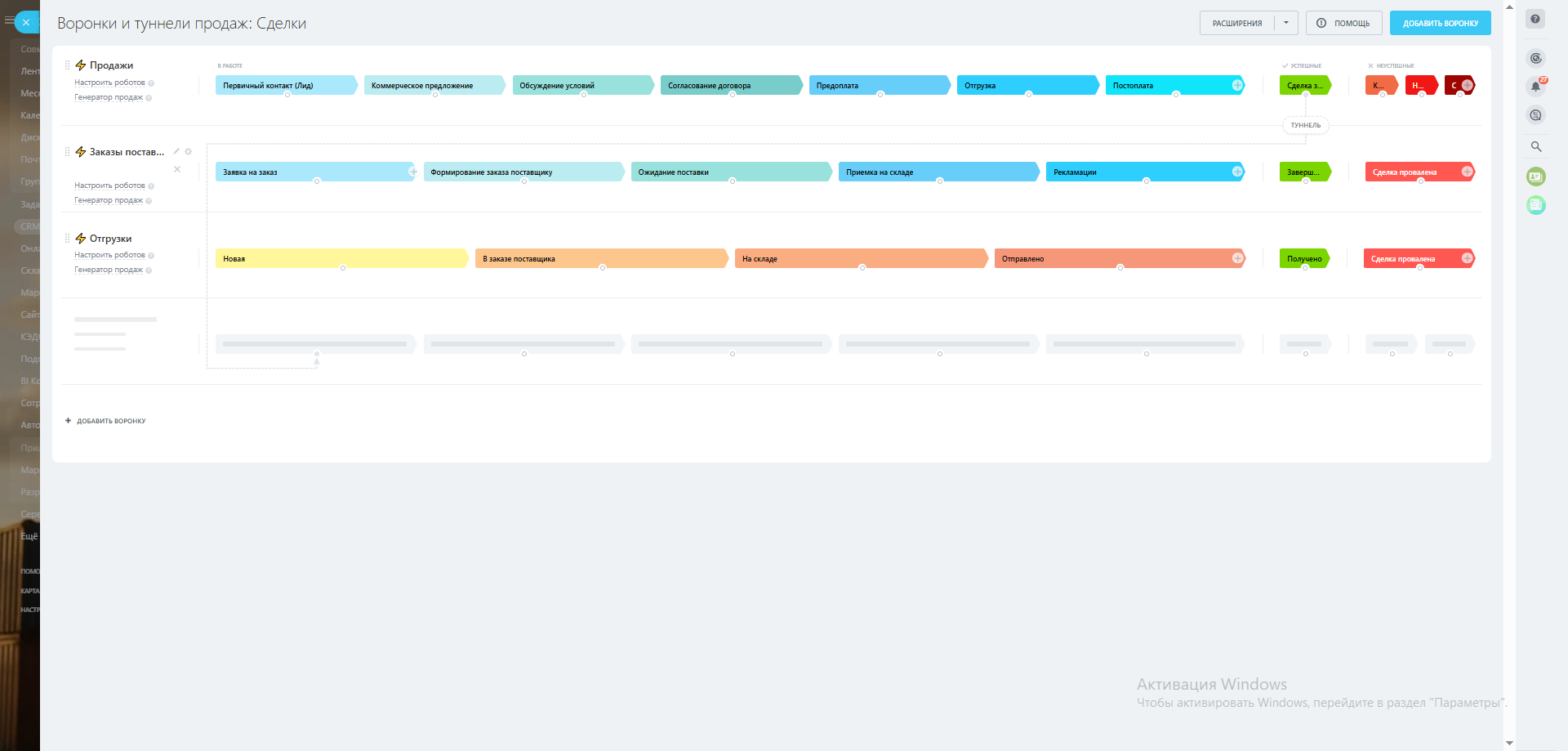 Три комплексные воронки — Продажи, Заказы поставщикам, Отгрузки. Такой подход обеспечивает полный контроль над всеми ключевыми этапами взаимодействия с поставщиками и клиентами. Вы видите полный цикл: от первичного интереса и продаж до оформления заказов и конечных отгрузок, что минимизирует риски и повышает прозрачность.
