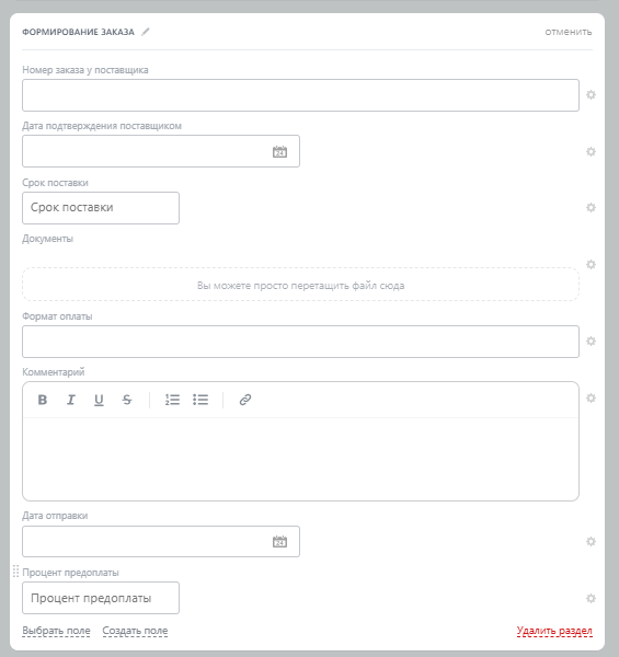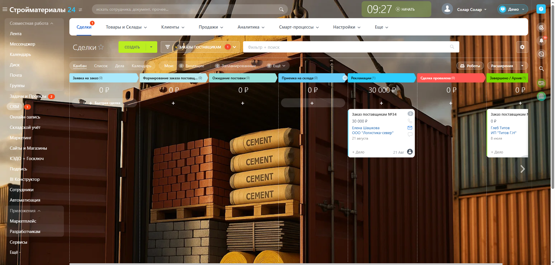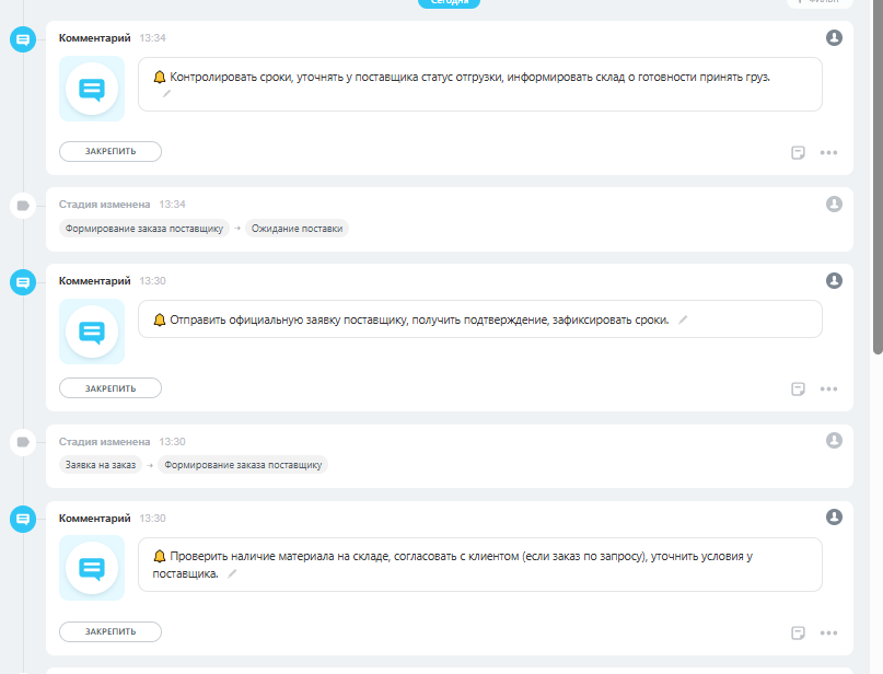- CRM-воронка: «Заказы поставщикам» - упрощает управление закупками, делая процесс прозрачным и понятным для всей команды. Благодаря автоматическому переходу заказов в успешную или неуспешную стадию по заданным условиям снижаются риски ошибок и задержек. Уведомления менеджерам помогают своевременно информировать о заказах, что улучшает коммуникацию и исключает недоразумения. Контроль оплаты обеспечивает точный мониторинг финансовых потоков и своевременное выполнение обязательств.