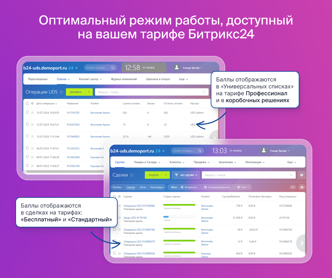 Интеграция позволяет работать с бонусной программой UDS, не выходя из Битрикс24: начисление, списание, контроль остатка - все операции с бонусами в Вашем Битрикс24.