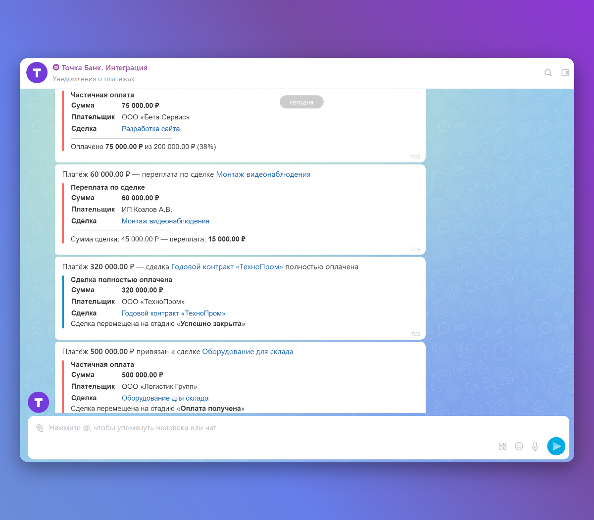 - В уведомлениях: менеджер получает сообщение с суммой, именем плательщика и ссылкой на сделки