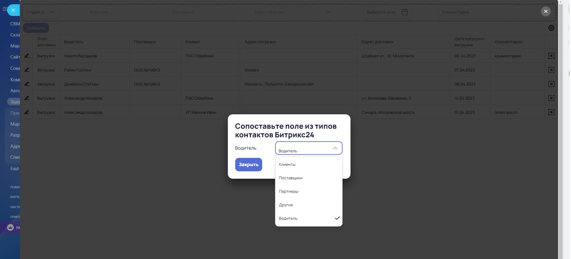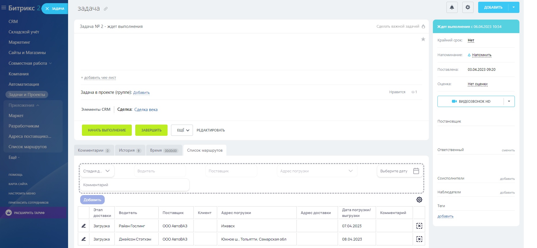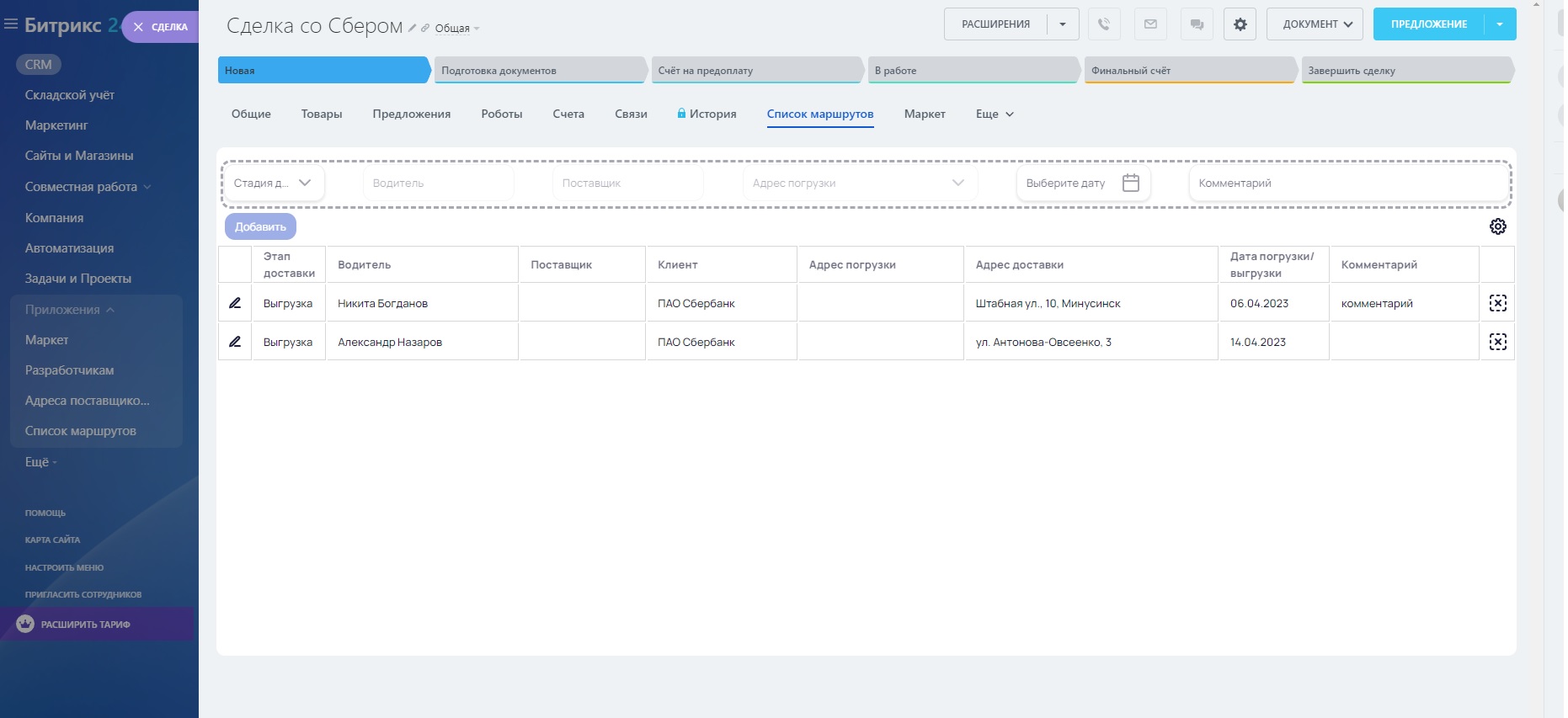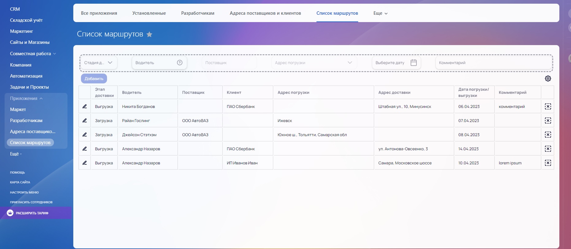 Приложение позволяет добавлять и хранить список маршрутов и водителей, которые выполняют доставку. Является дополнением к приложению "Адреса поставщиков и клиентов" https://www.bitrix24.ru/apps/app/sologroupltd.adresa_postavshchikov_i_klientov/"