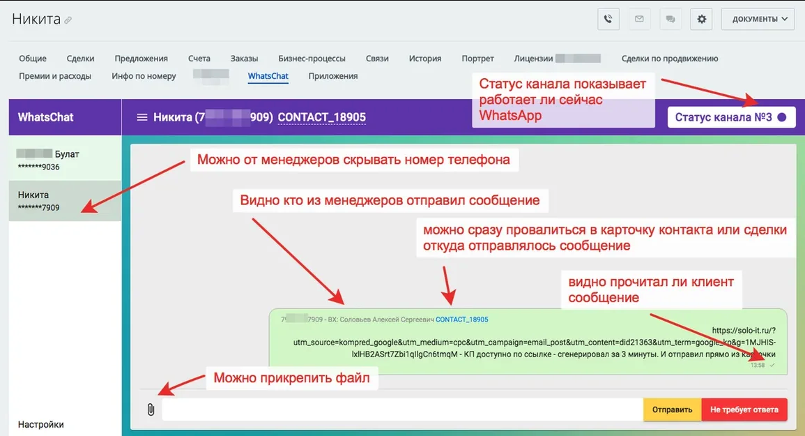 Приложение WhatsChat предназначено для ведения общения сотрудника компании с клиентом в среде WhatsApp (самого популярного мессенджера на сегодняшний день) прямо из корпоративного портала Битрикс24 с сохранением диалога в среде Битрикс24.