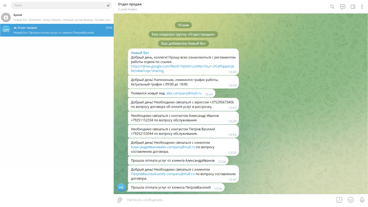 Приложение очень простое в установке и настройке. Достаточно подключить Telegram бота и добавленные сотрудники начнут получать требуемые уведомления. Отправка сообщений в Telegram происходит через роботов или бизнес-процессы.