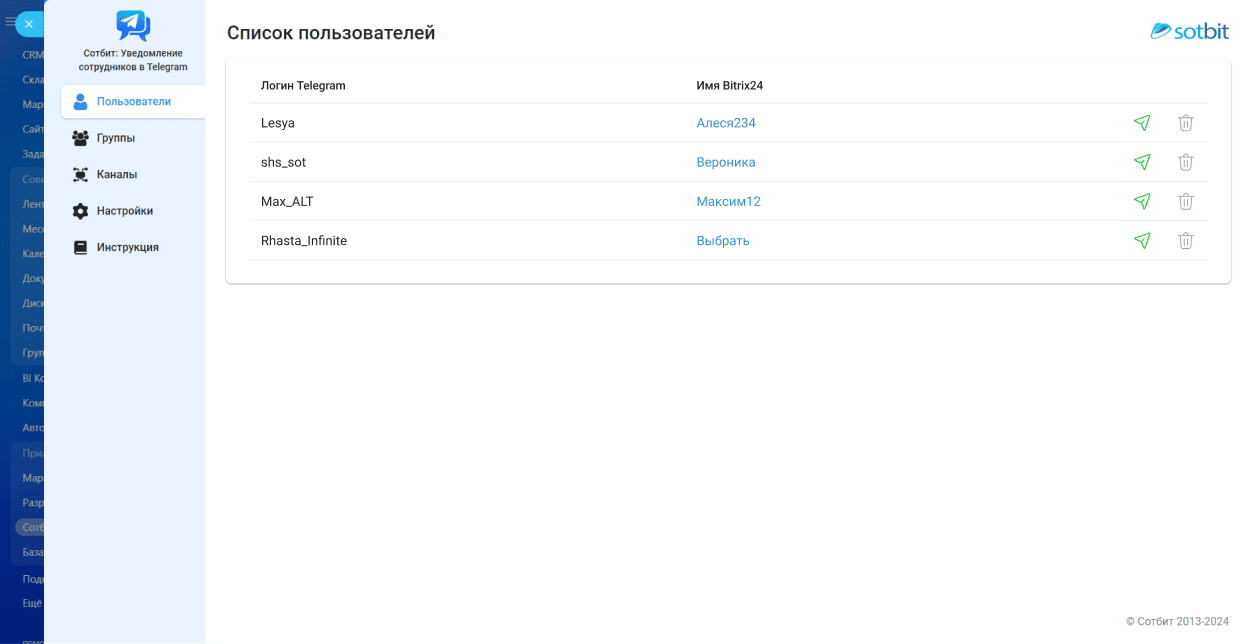Сотбит: Уведомление сотрудников в Telegram – приложение уведомит каждого сотрудника вашего портала Битрикс24 о важных делах и задачах в Telegram мессенджере.