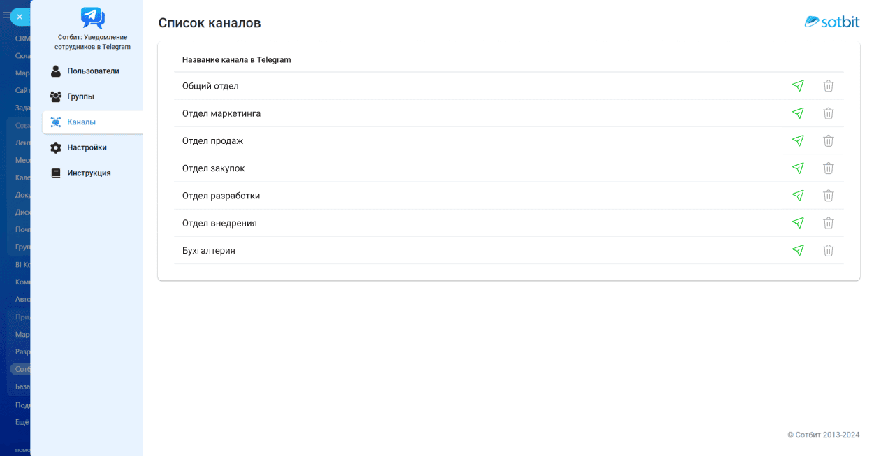 | Документация Подробная документация на Сотбит: Уведомление сотрудников. в Telegram позволит максимально упростить процесс изучения особенностей приложения. | ![]() |