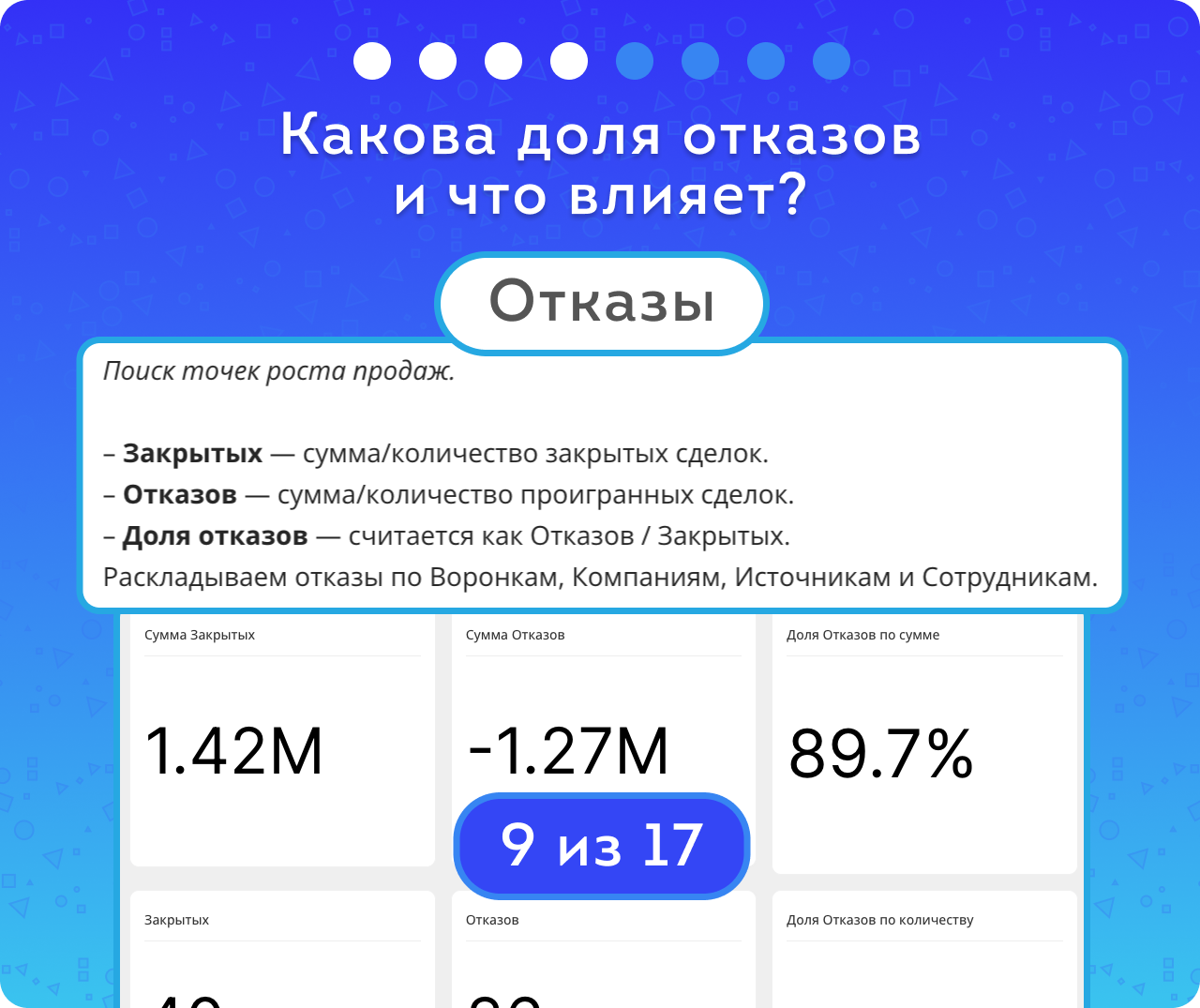 Анализируется сумма и количества проигрышей, а также Доля отказов — считается как Отказов / Закрытых.