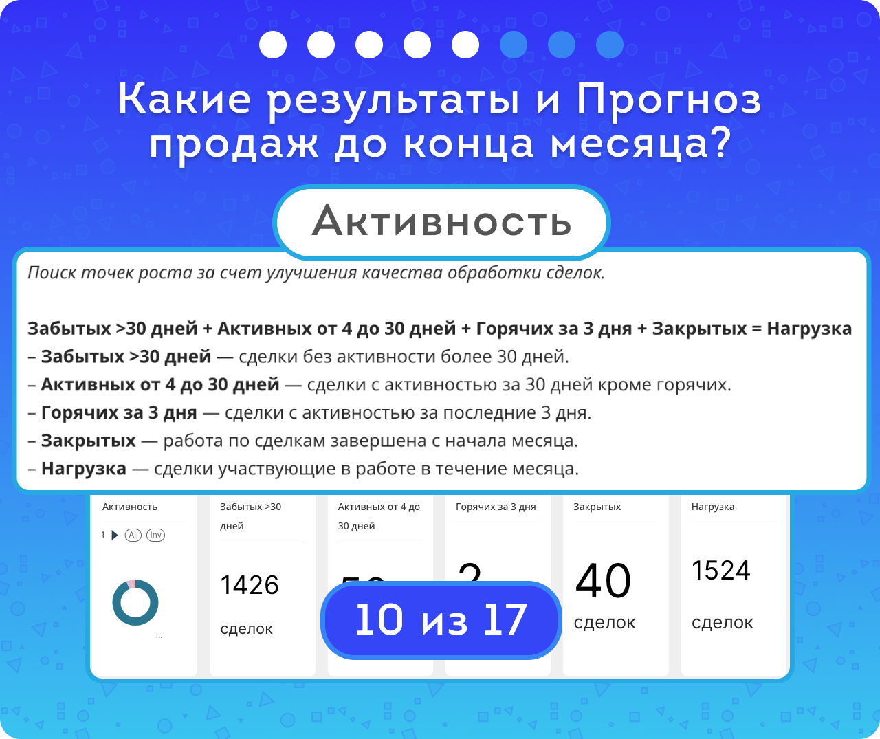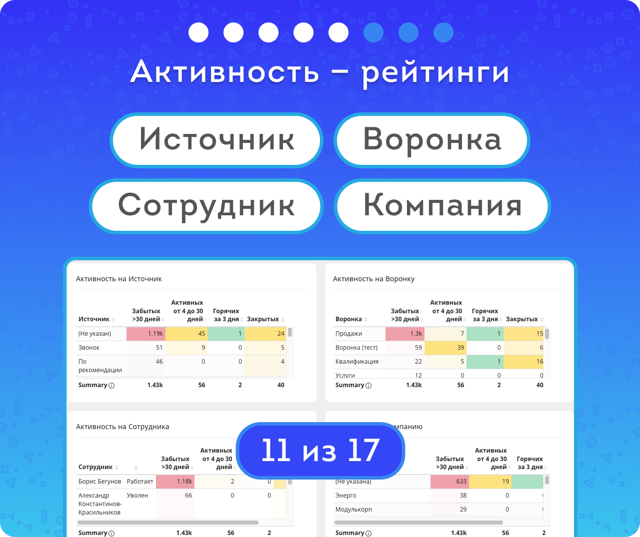 метрикам Активности (Активные / Горячие / Забытые / Закрытые);