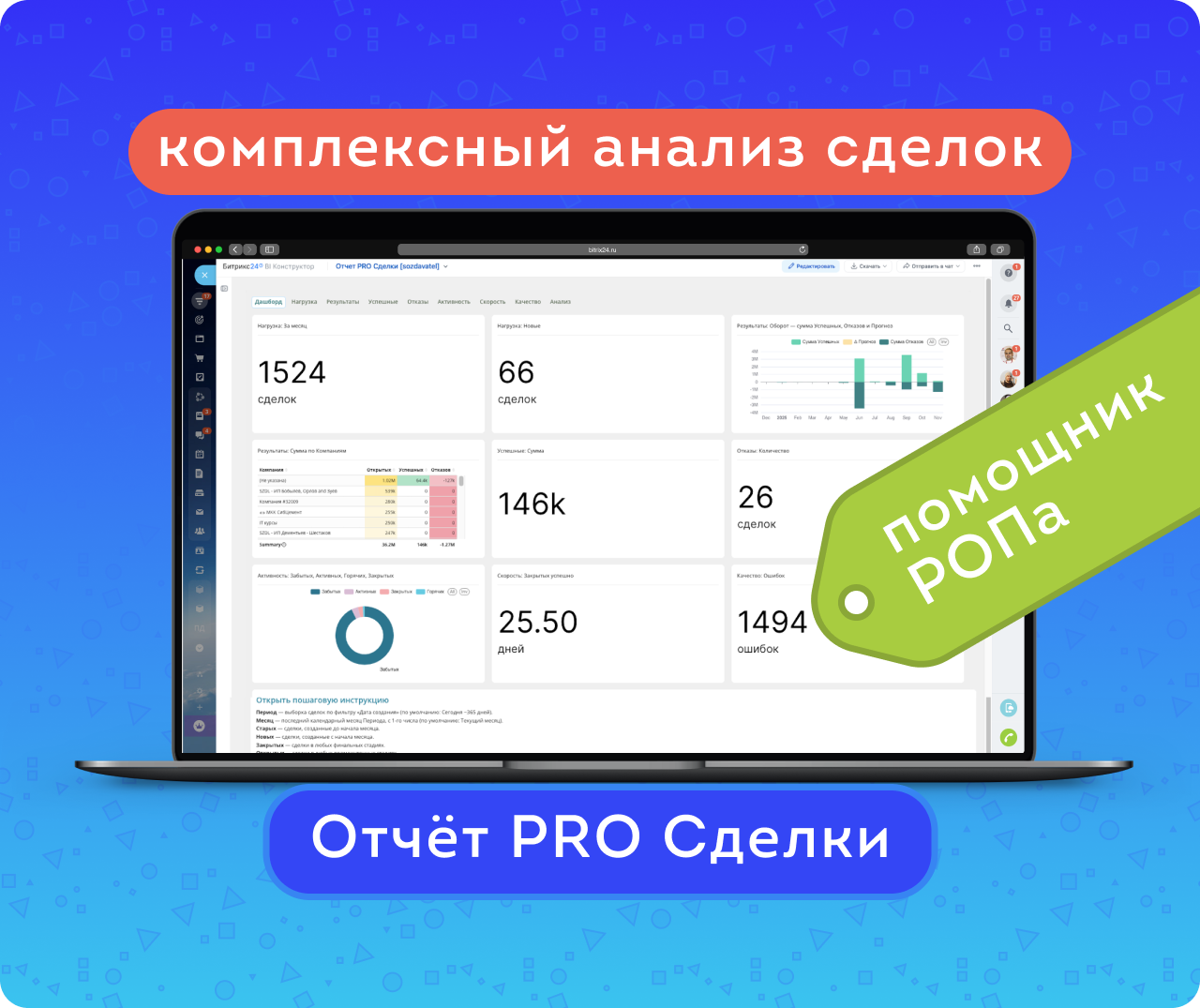 Отчёт PRO Сделки — полноценный инструмент для управления продажами. Он поможет руководителю получить картину всего происходящего в отделе продаж, разобраться в причинах, повысить эффективность команды и найти точки роста. А если нужно оценить загрузку и состояние задач всей команды, используйте Отчёт PRO Задачи — в нём больше ста метрик, и он отлично дополняет аналитику руководителя.