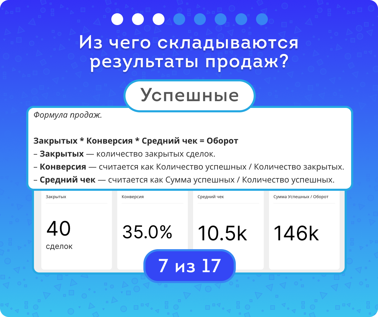 Формула: Закрытых * Конверсия * Средний чек = Оборот. При этом Конверсия — это Количество успешных / Количество закрытых, а Средний чек —это Сумма успешных / Количество успешных.