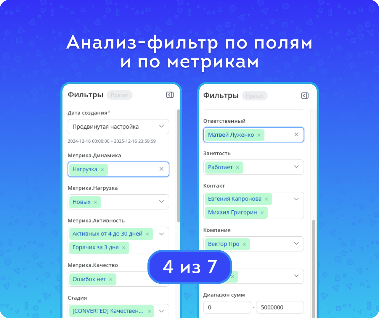 компании, контакту, источнику и диапазону сумм;