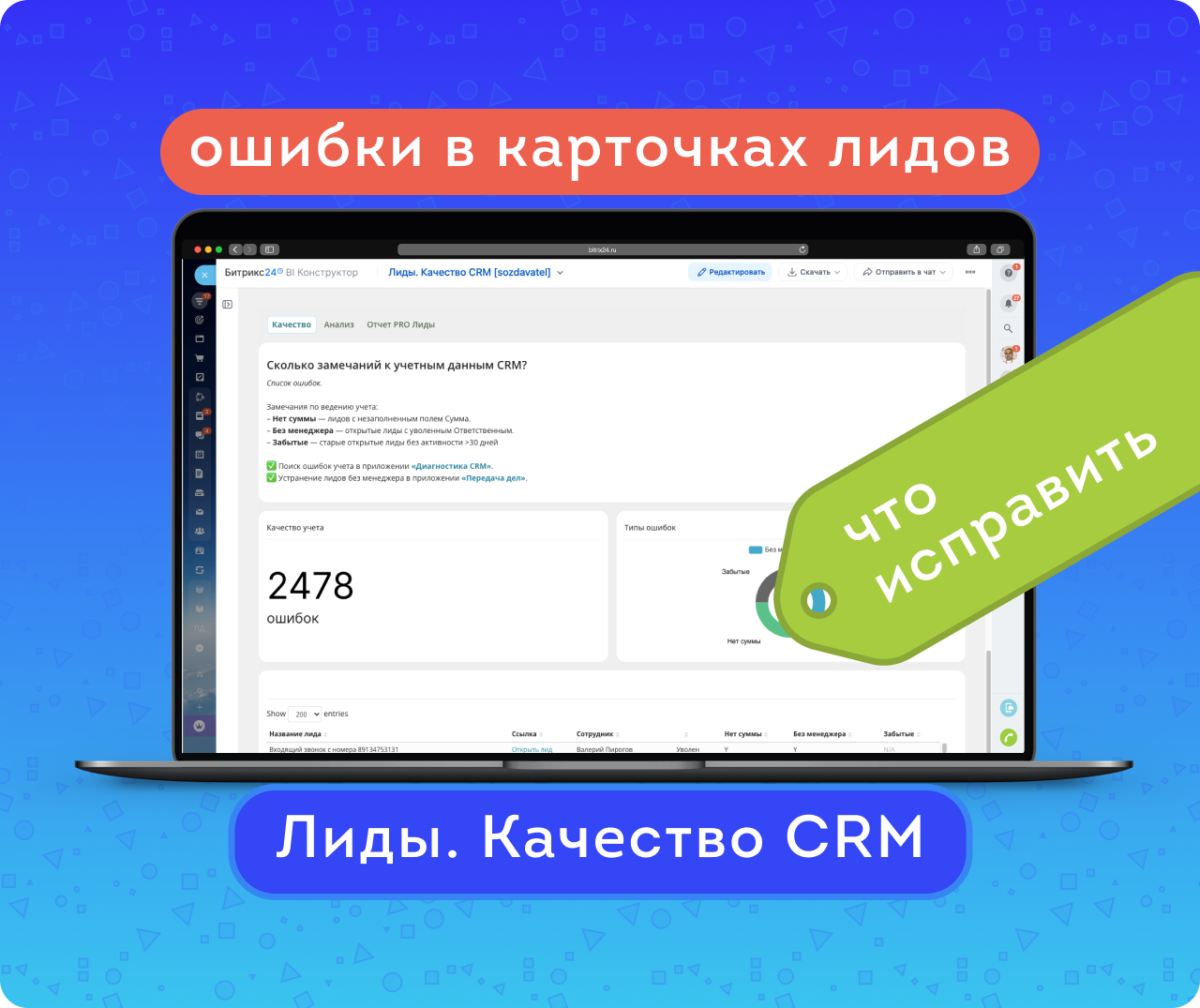 Лиды. Качество CRM — BI-отчёт для Битрикс24, который находит потерянные лиды и ошибки в данных. Помогает контролировать работу менеджеров и повышать достоверность данных.