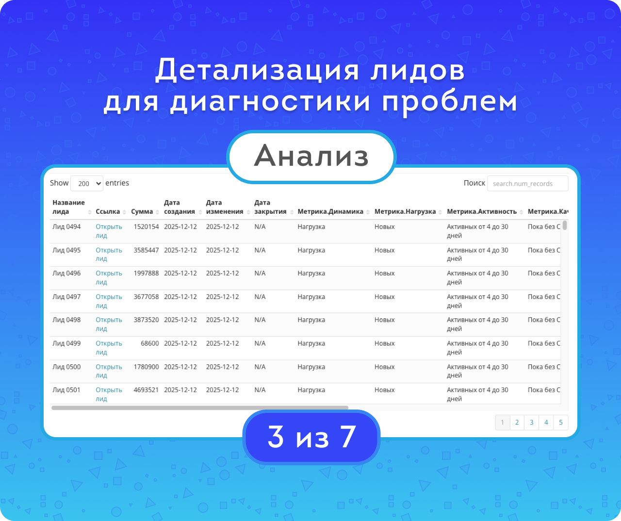 Вкладка «Анализ» представляет собой таблицу с полным списком лидов. Она позволяет сортировать данные, быстро находить нужные строки с помощью поиска, а также переходить по активным ссылкам непосредственно в лиды. Это позволит быстро поправить данные, обеспечивая корректность аналитики и прогнозирования продаж.