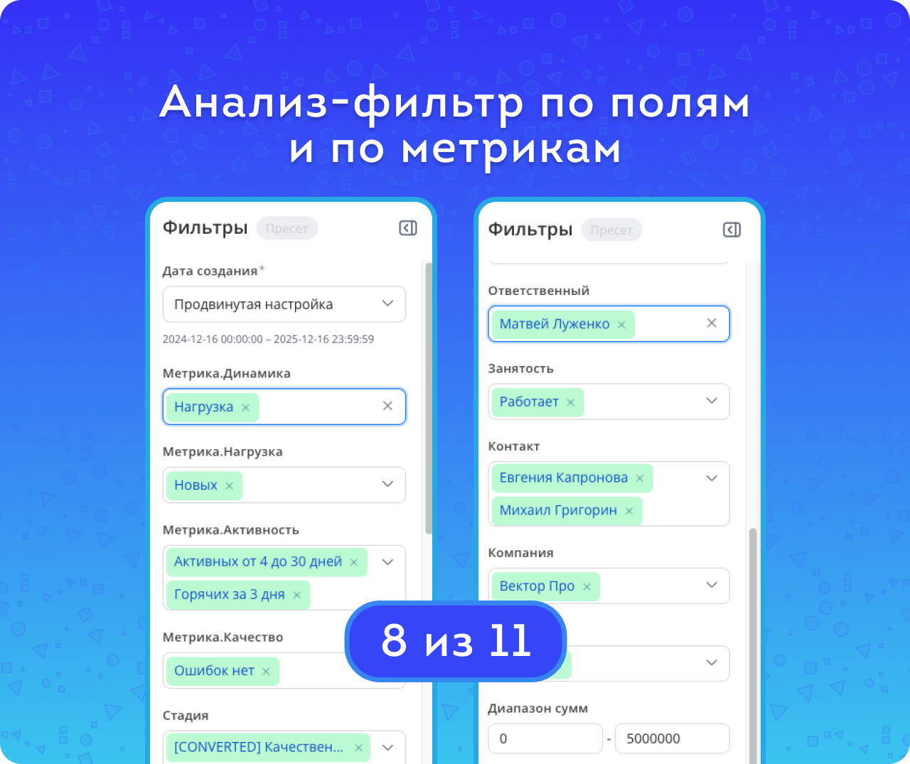 Когда возникает необходимость глубже разобраться в результатах продаж, подойдёт Отчёт PRO Сделки — более 100 метрик по воронке, конверсии и эффективности. А чтобы понять, как эта нагрузка реализуется в ежедневной работе команды, используйте Отчёт PRO Задачи.