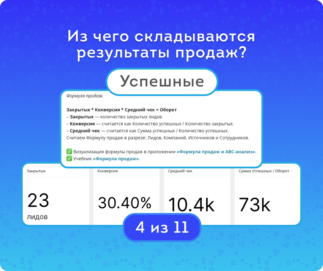 Вкладка «Успешные» предназначена для анализа качества выигранных лидов и эффективности работы. В ней рассчитываются ключевые показатели конверсии, среднего чека и оборота.