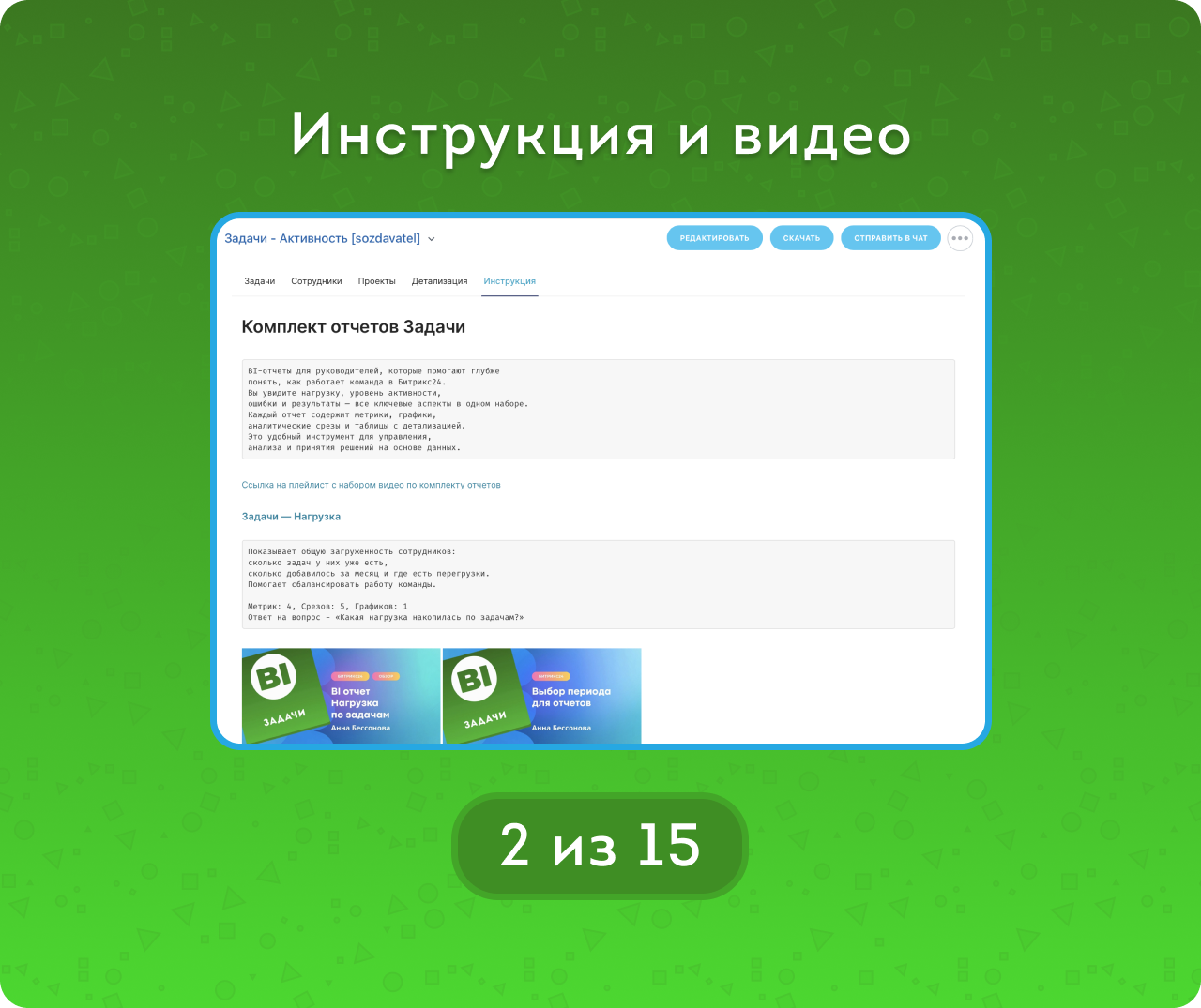 Отчет включает пять вкладок: «Задачи», «Сотрудники», «Проекты», «Детализация» и «Инструкция». На первых трёх собраны ключевые метрики и графики, позволяющие оценить активность и эффективность работы с задачами. Вкладка «Детализация» представляет собой таблицу всех задач с активными ссылками на них. Раздел «Инструкция» содержит полезные материалы — ссылки на связанные BI-отчеты и видеообзоры по их использованию.