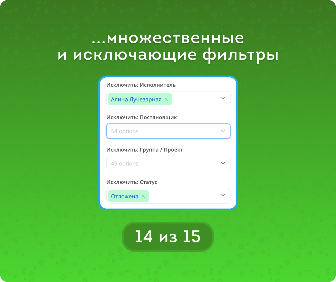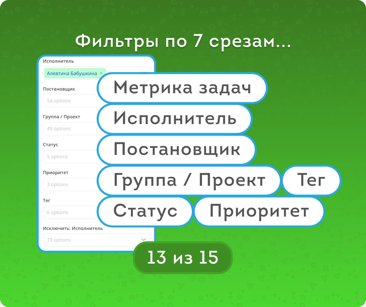 Для уточнения данных можно воспользоваться фильтрами: по исполнителю, постановщику, проекту, статусу задач и тегам. Фильтры гибкие — можно выбрать сразу несколько значений, чтобы получить более точную картину. Кроме того, исключающие фильтры помогут сузить выборку данных, позволяя сосредоточиться на самом важном.