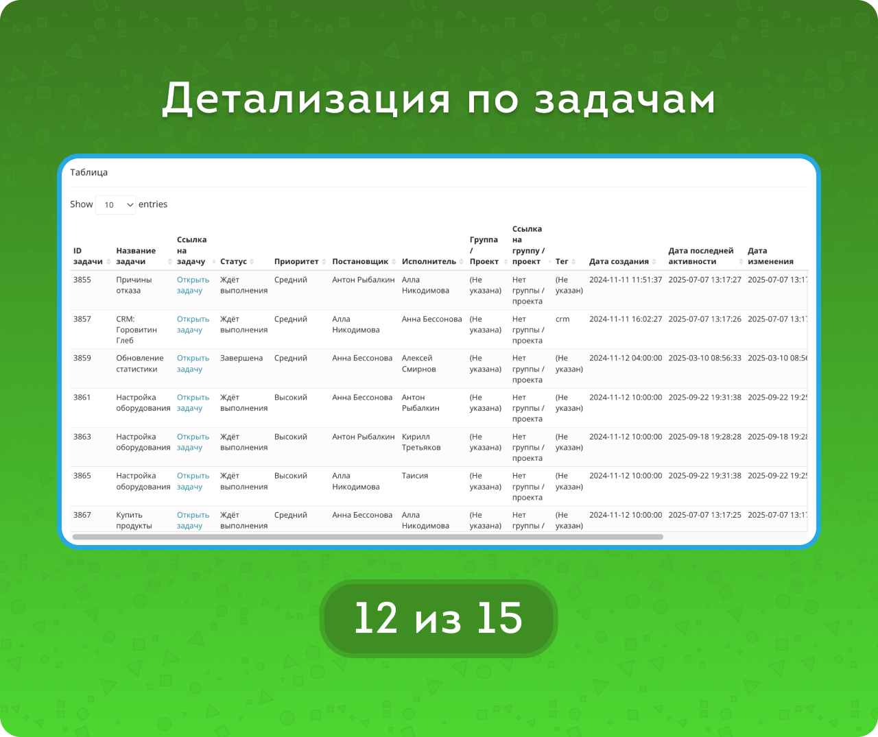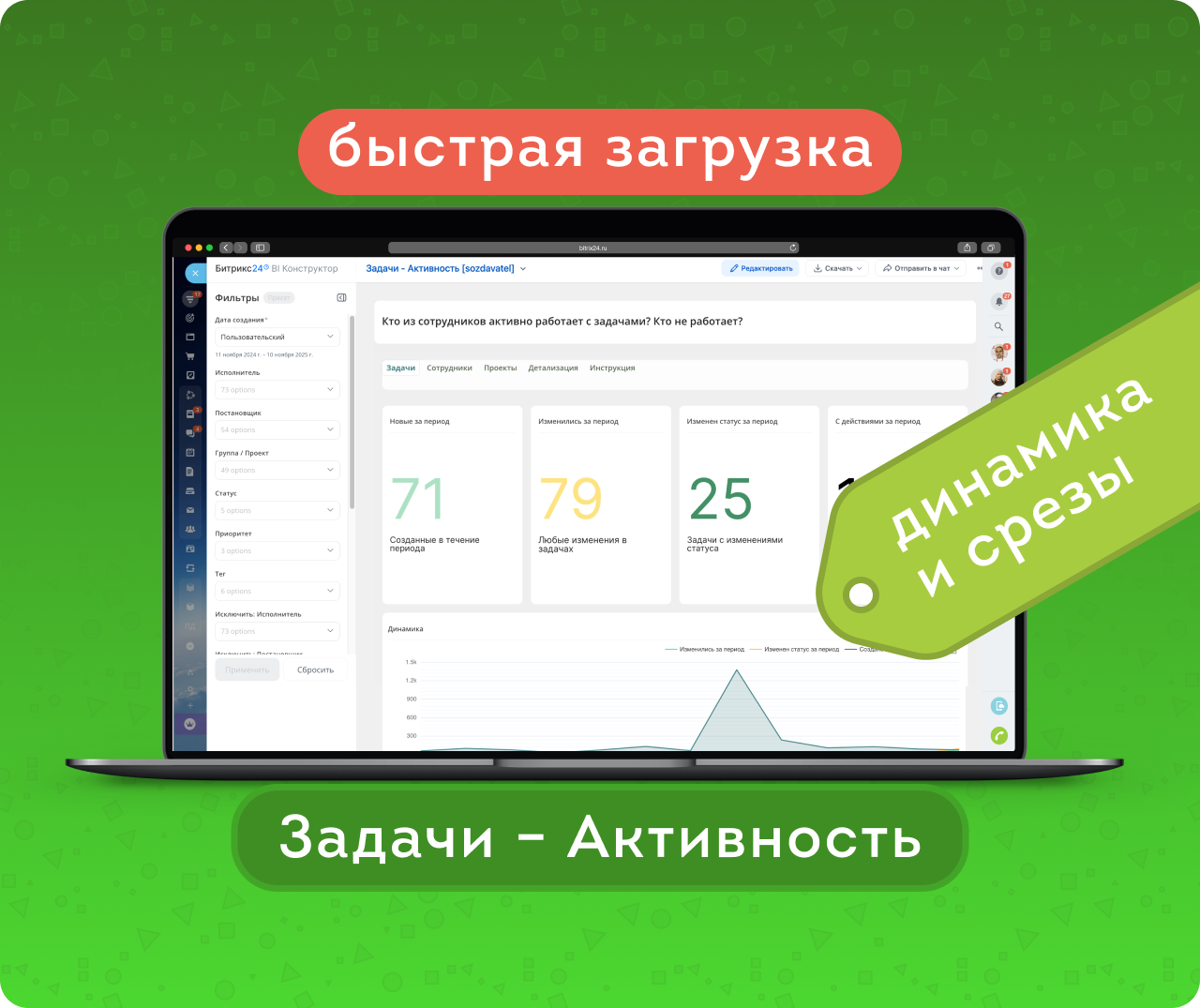 BI отчет Задачи — Активность — инструмент для оценки вовлеченности и эффективности работы с задачами. Помогает отслеживать динамику работы, выявлять узкие места и повышать эффективность команды.