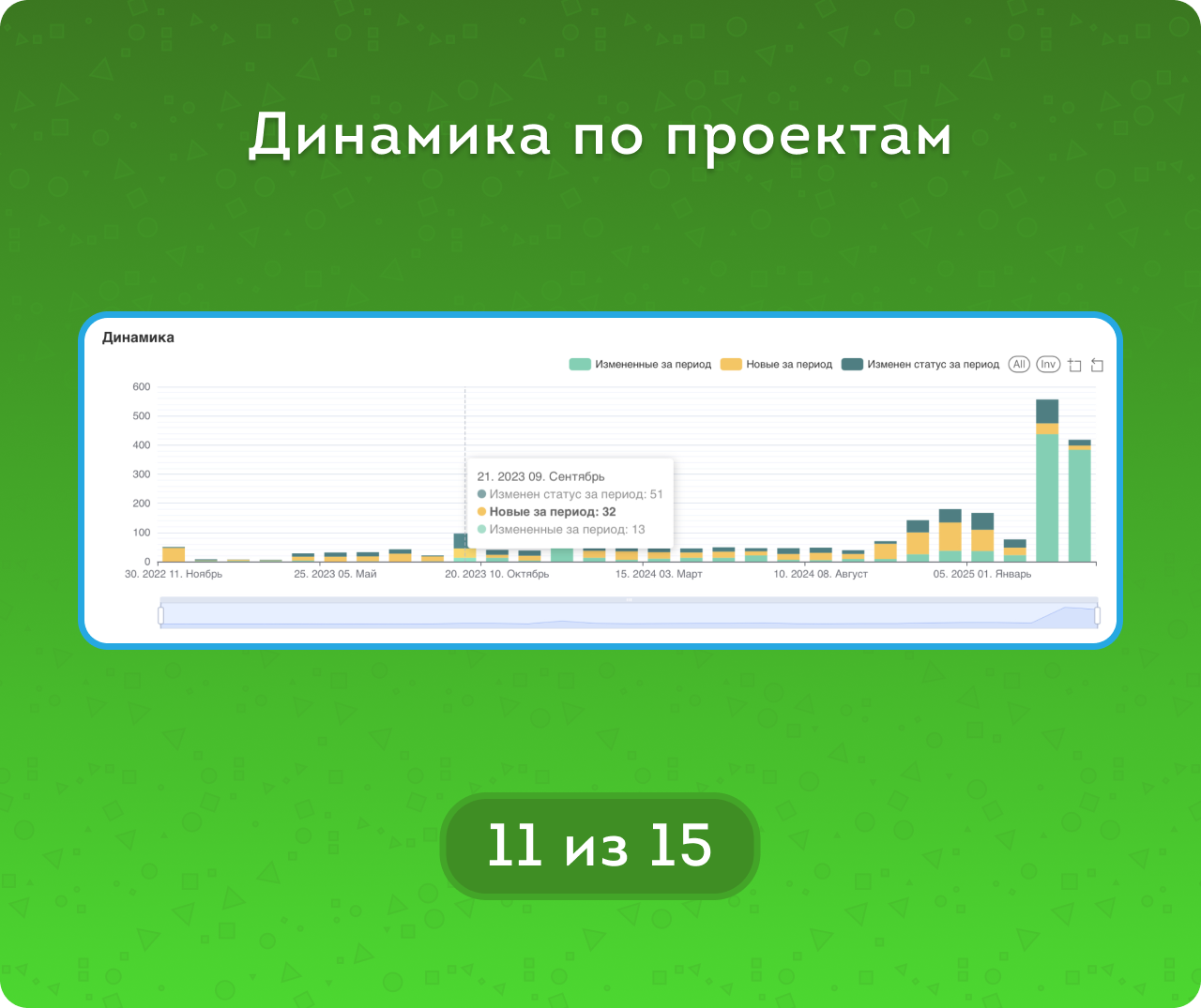 График динамики отражает, как менялось число активных проектов с задачами в разные периоды, а также средний уровень активности на один проект. Таблица «Влияние» ранжирует проекты.