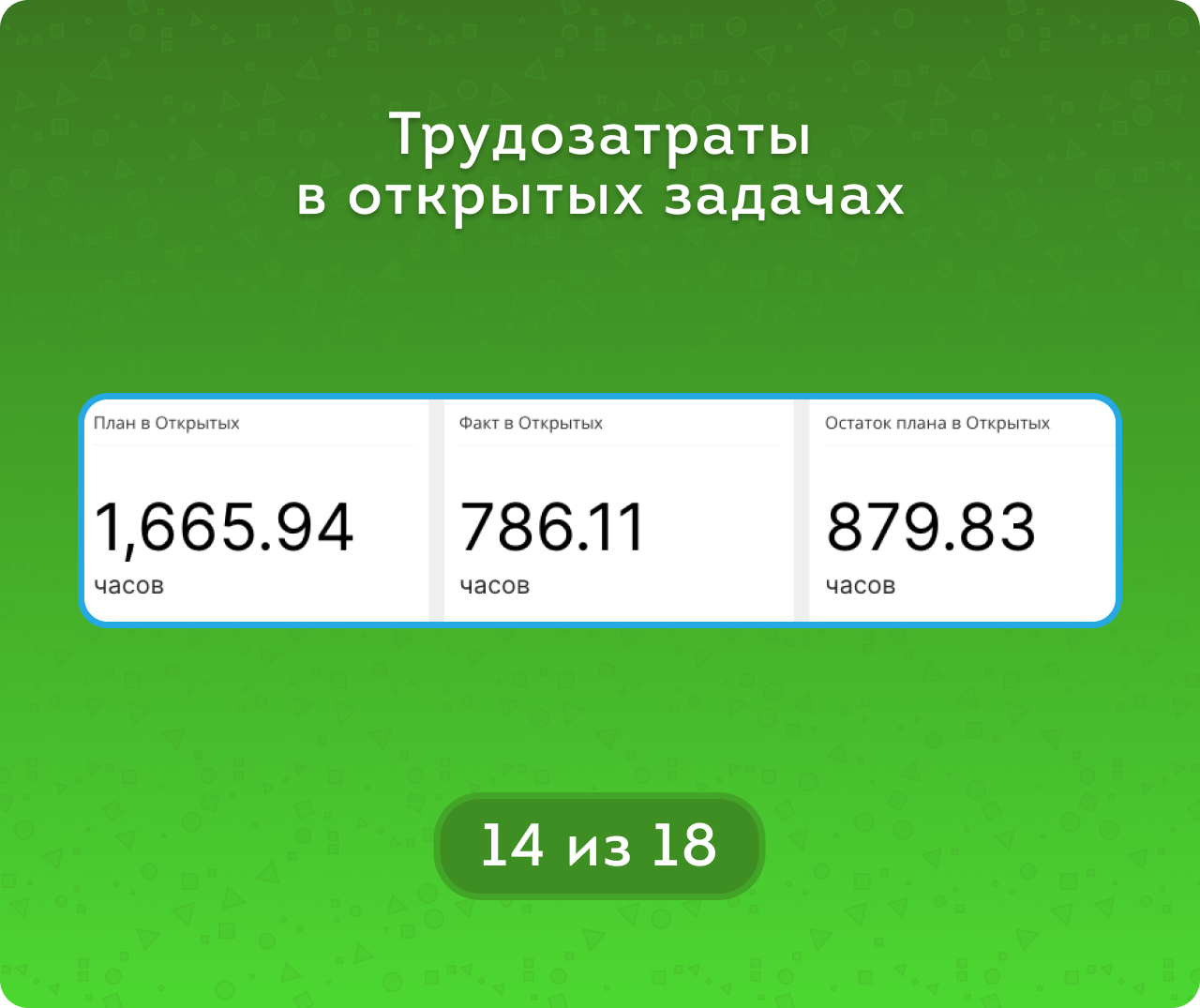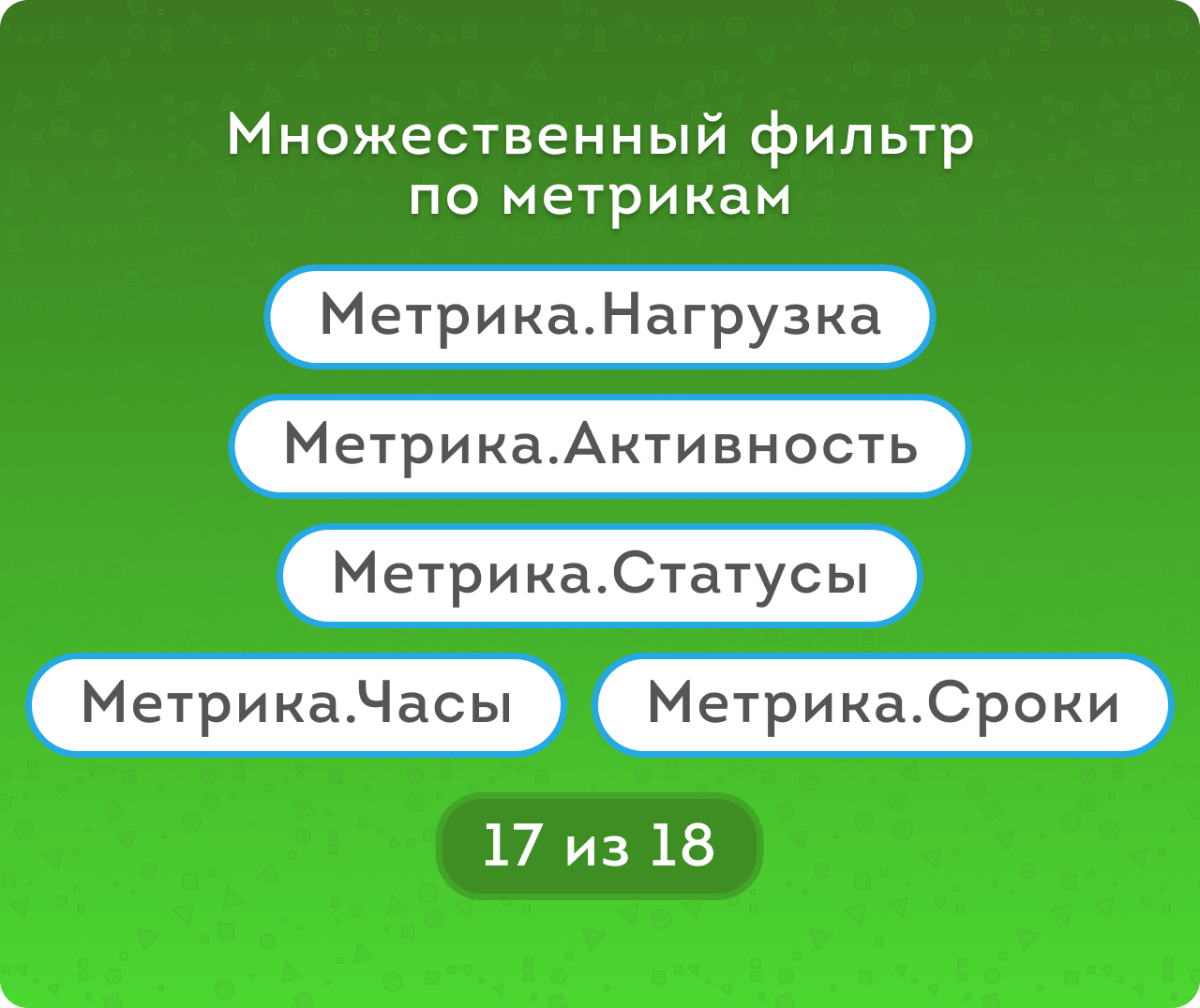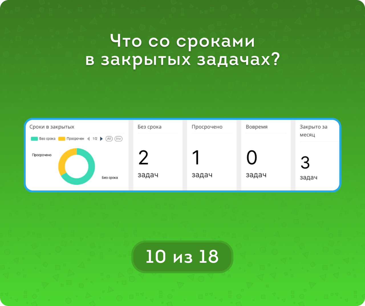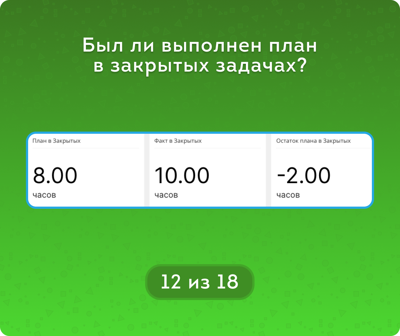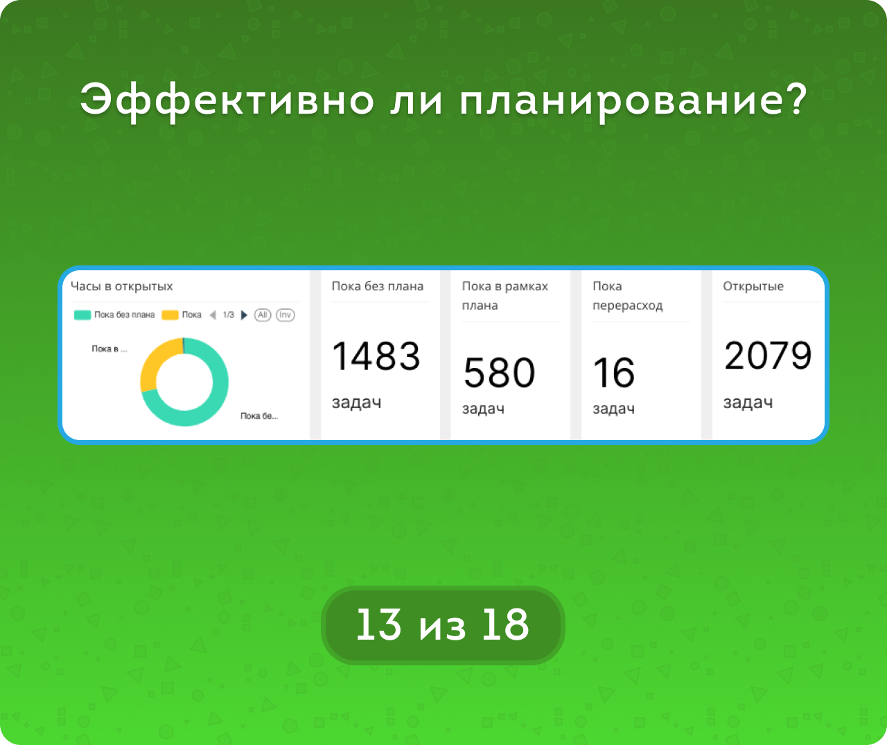 метрикам Сроков (Без срока / Вовремя / Просрочено) и метрикам Часов (В рамках плана / Не завершено / Перерасход) для закрытых задача, а для открытых – Пока вовремя / Пока в рамках плана и тд.