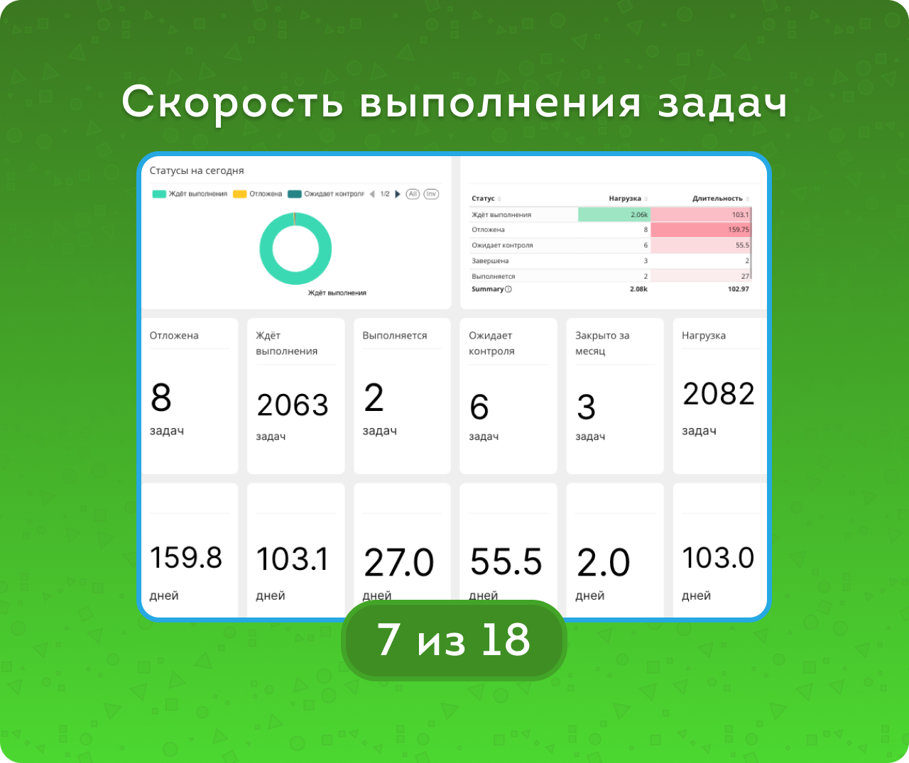 Вкладка «Дашборд» содержит в себе те метрики, которые помогут руководителю быстро оценить ситуацию: растет или падает активность, какова текущая нагрузка и средняя длительность задач, сроки и остаток часов.