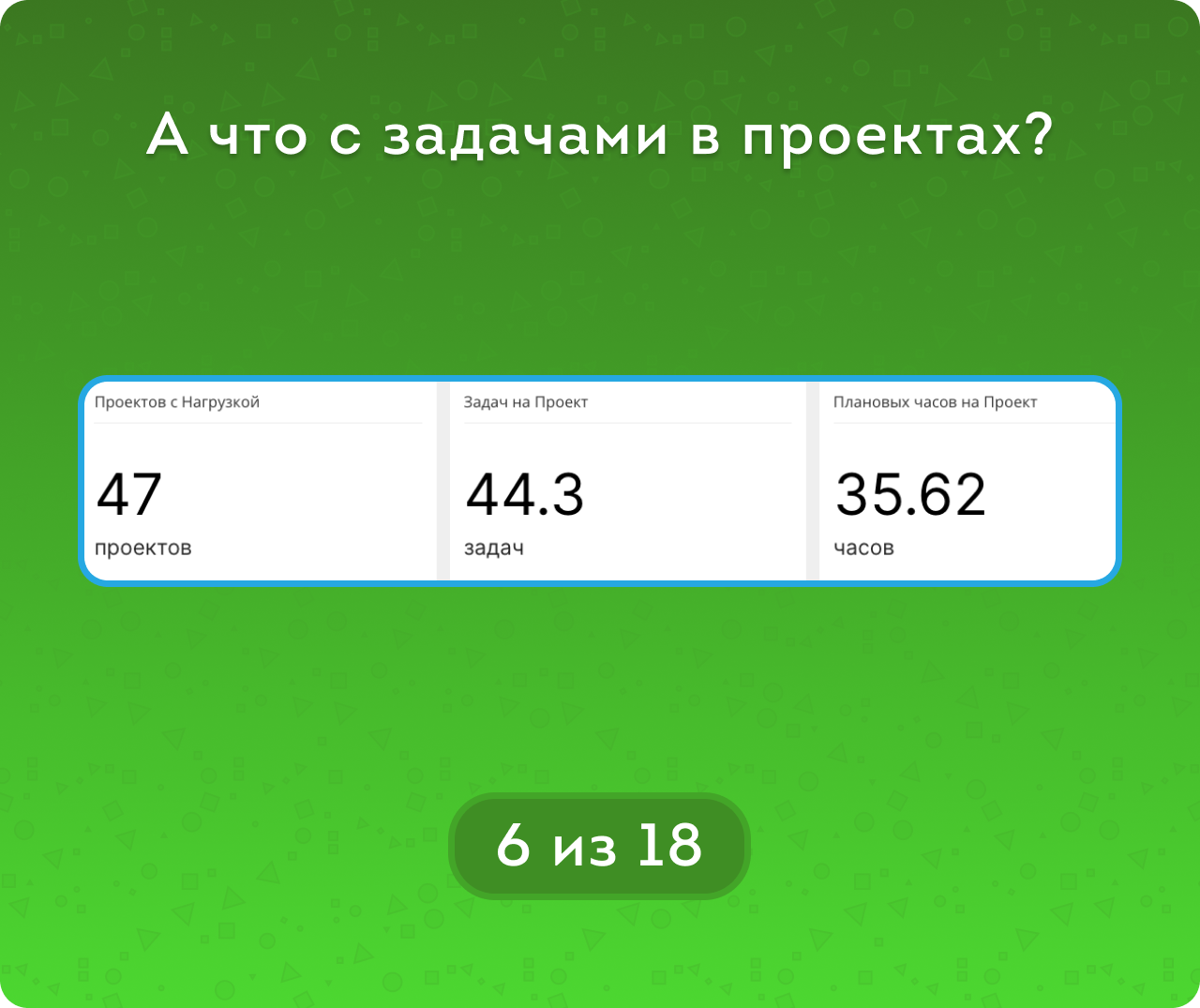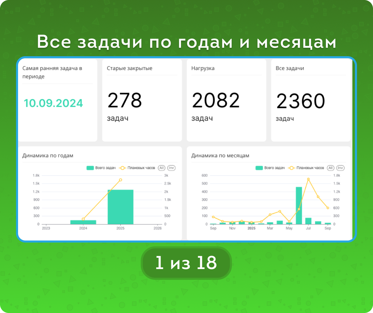 Отчёт PRO Задачи — это настоящая приборная панель управления задачами. Здесь всё: сроки и дедлайны, нагрузка и часы, показатели эффективности. Более ста ключевых метрик помогут увидеть ситуацию целиком, а не фрагментами.