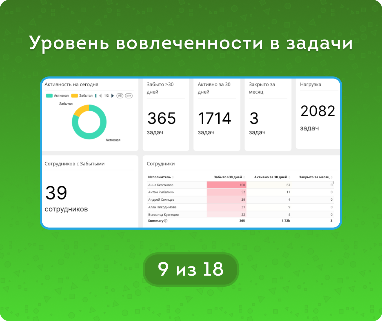 Вкладка «Активность» отвечает на вопрос «Кто активно выполняет, а кто забывает задачи?»