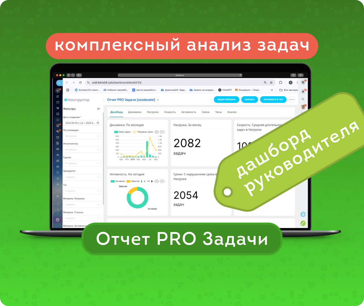 Отчет PRO Задачи состоит из 8 вкладок: Дашборд, Динамика, Нагрузка, Скорость, Активность, Сроки, Часы и Анализ.