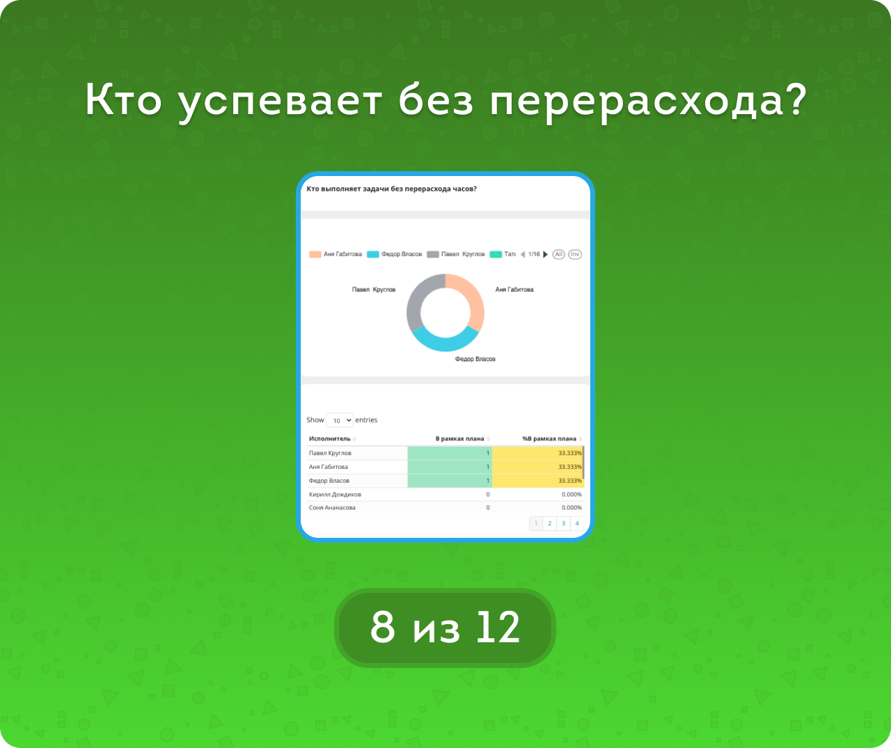 Круговые диаграммы и таблицы с рейтингом помогают понять, кто чаще других превышает план, а кто стабильно укладывается в установленные рамки.