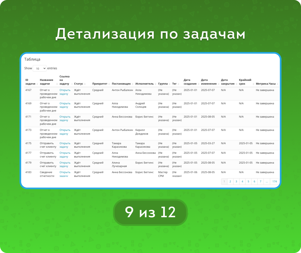 Для более глубокого анализа в отчете представлена таблица с полным списком задач. Она позволяет сортировать данные по полям задач, быстро находить нужные строки с помощью поиска, а также переходить по активным ссылкам в сами задачи.
