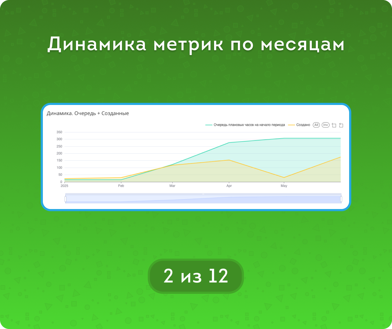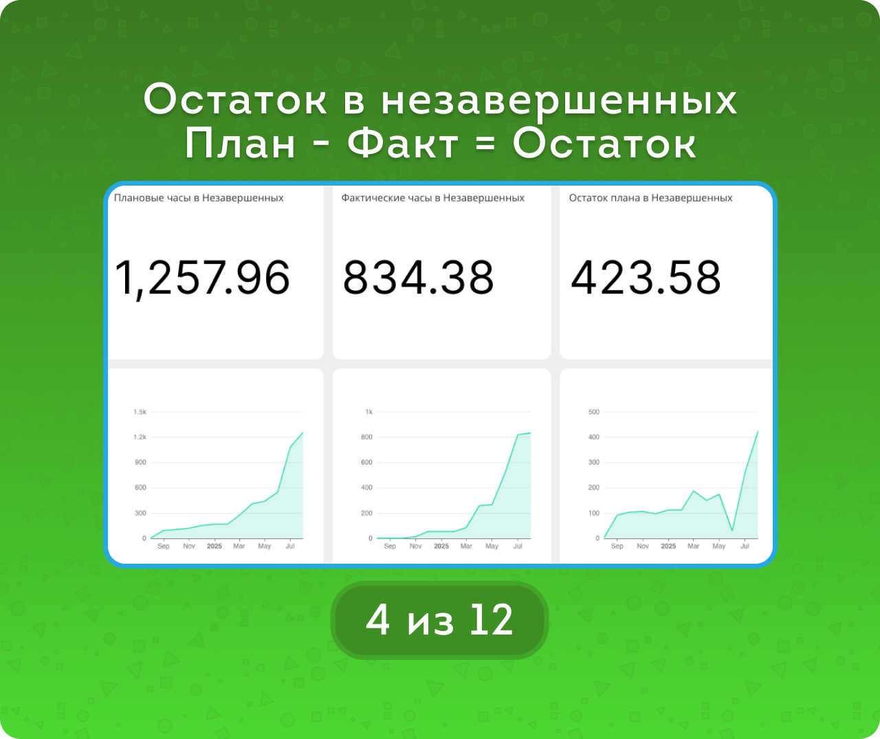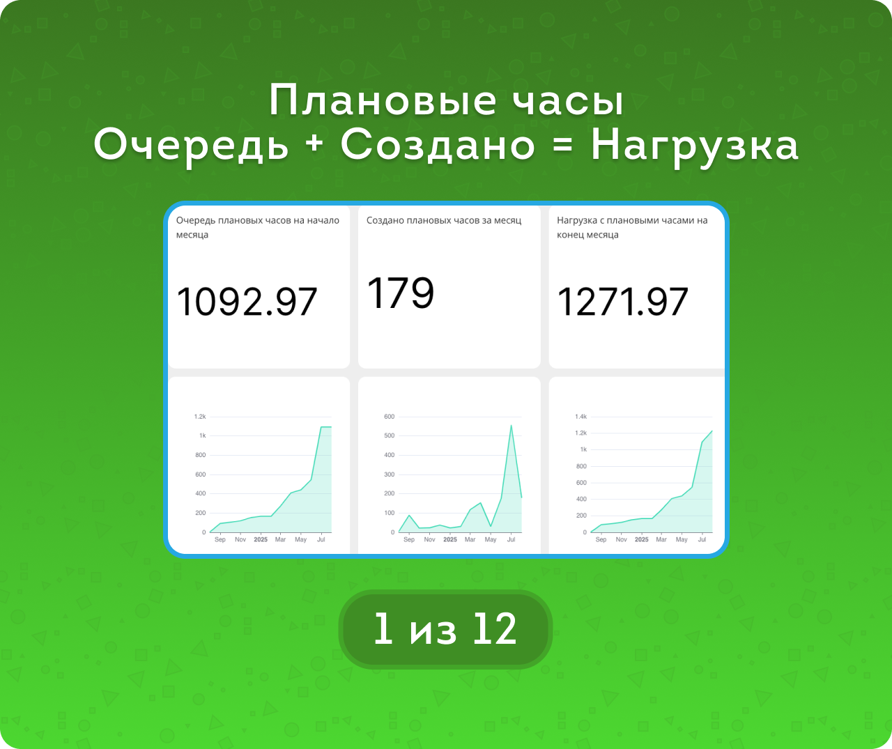 Часы в задачах делятся на Очередь плановых часов – то, что не было закрыто к началу текущего месяца, и Создано плановых часов – запланированное время в новых задачах.