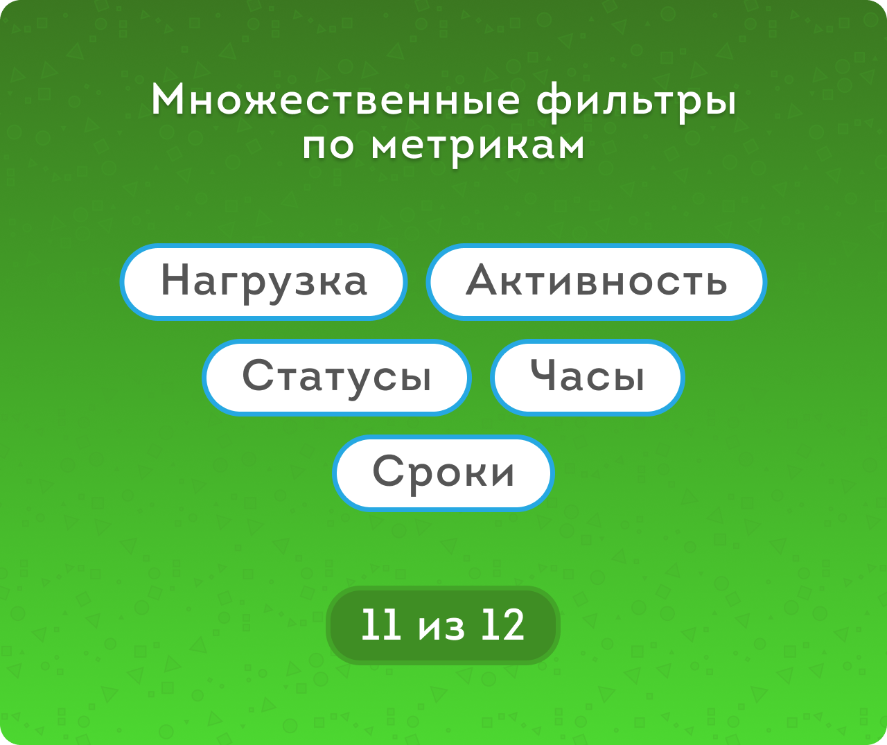 метрикам Сроков (Без срока / Вовремя / Просрочено) и метрикам Часов (В рамках плана / Не завершена / Перерасход).