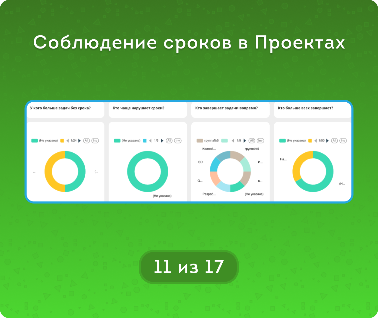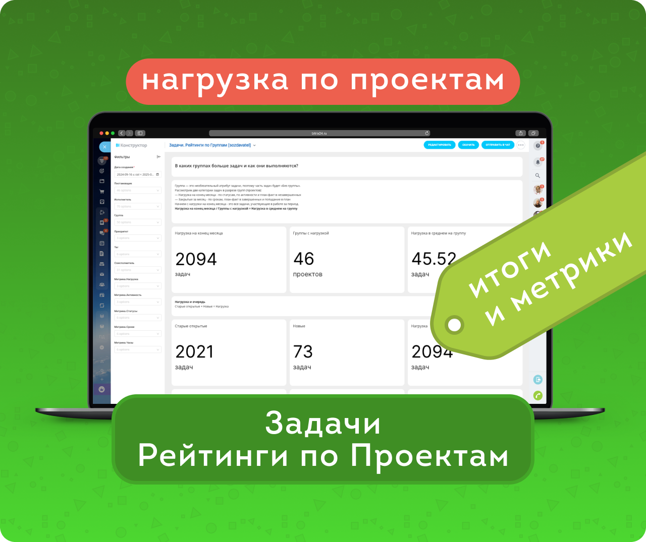 Задачи.Рейтинги по проектам — это наглядный инструмент для контроля загрузки проектов. А комплексный Отчет PRO Задачи включает в себя более ста метрик для более глубокой аналитики.