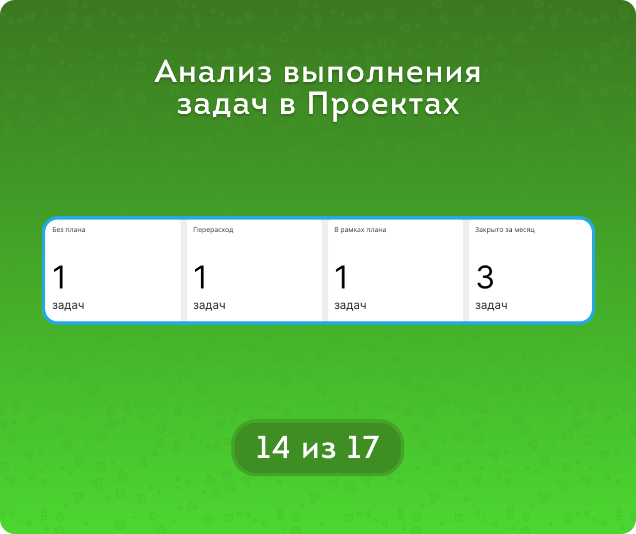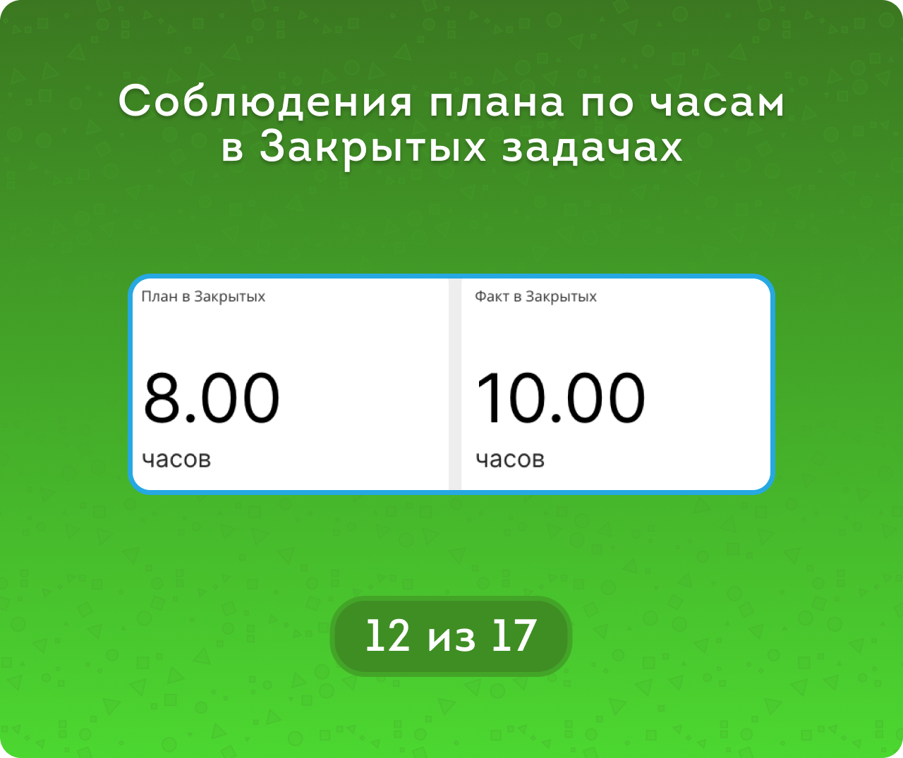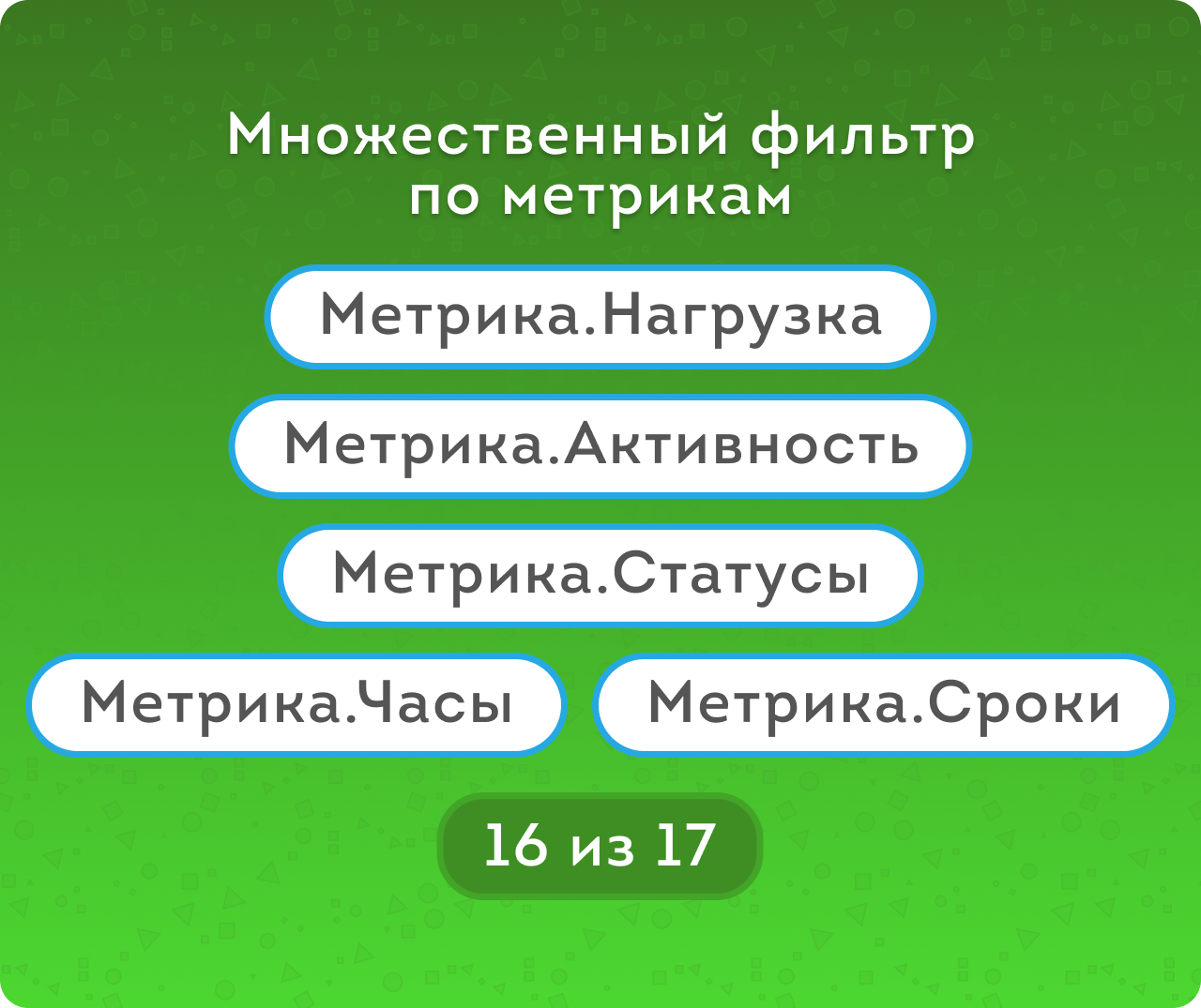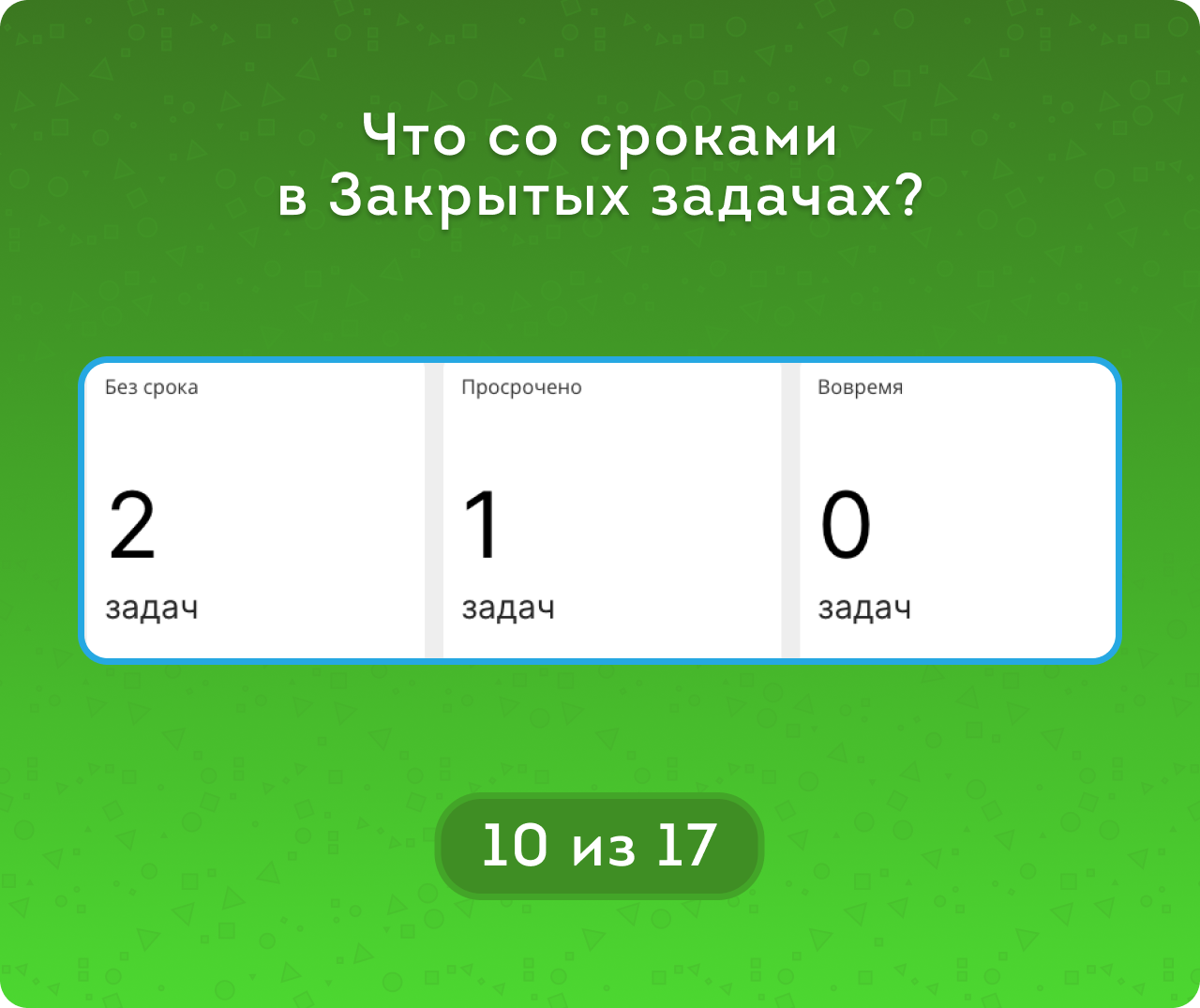 метрикам Сроков (Без срока / Вовремя / Просрочено) и метрикам Часов (В рамках плана / Не завершено / Перерасход) для закрытых задача, а для открытых – Пока вовремя / Пока в рамках плана и тд.