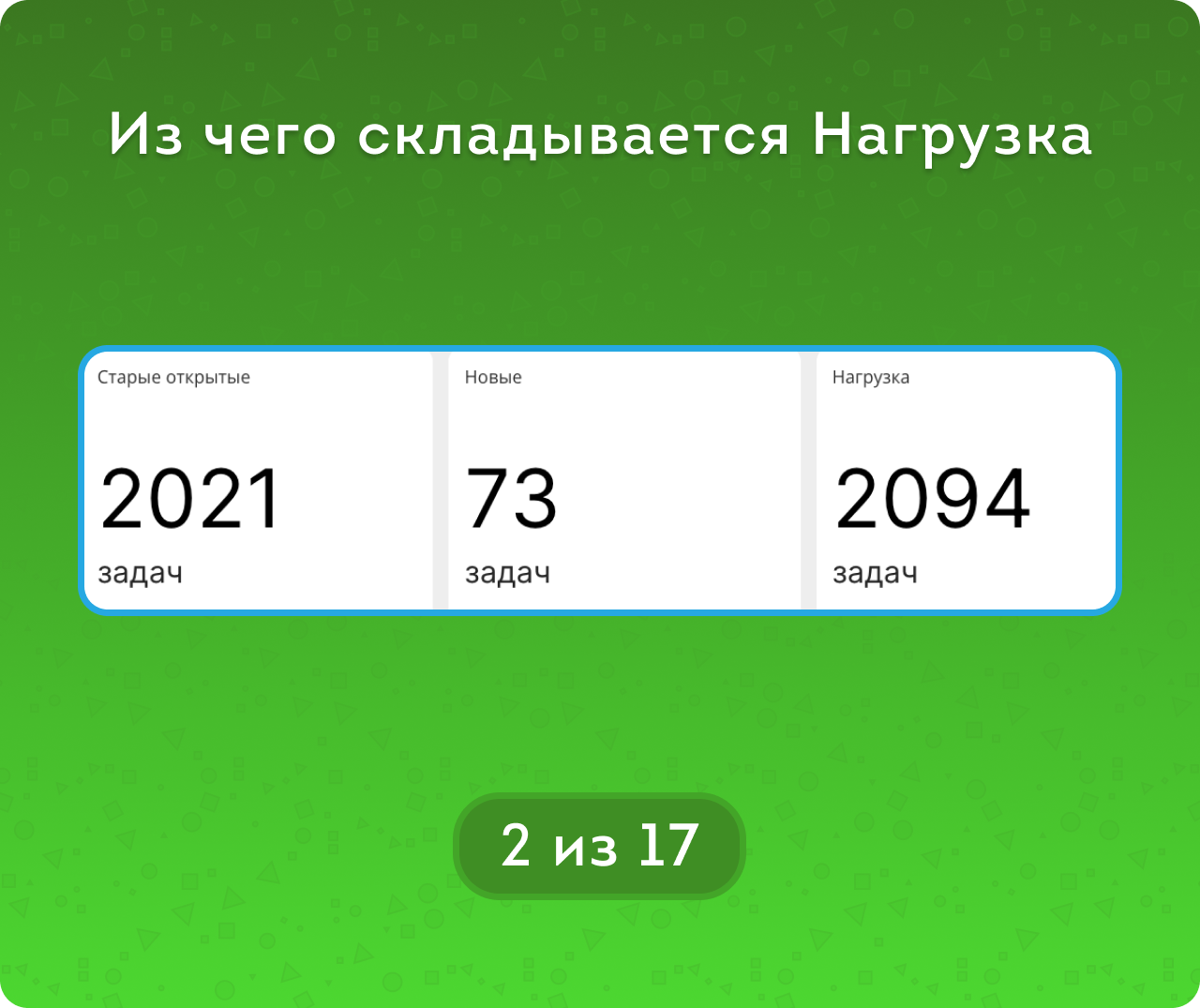Нагрузка — сумма старых открытых задач и новых, созданных за текущий месяц. Группы с нагрузкой — проекты (группы или коллабы), в которых в это время велась работа над задачами. А Нагрузка в среднем, на группу — среднее число задач, приходящихся на один проект.