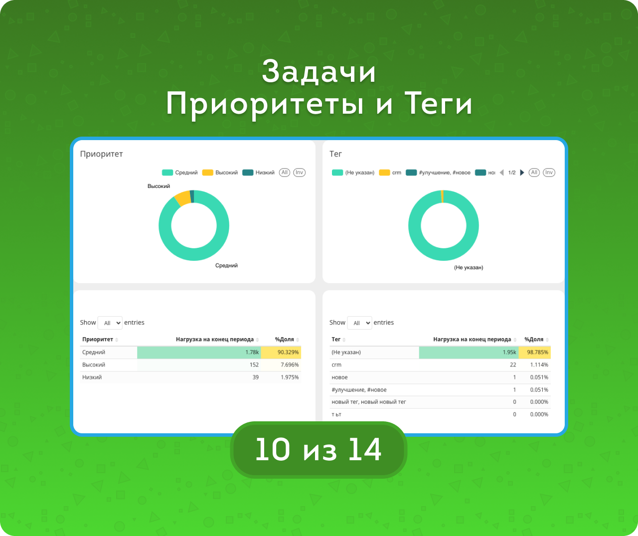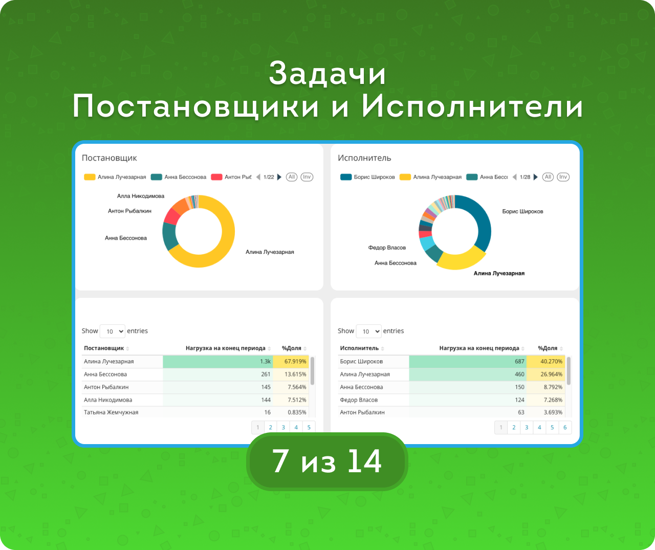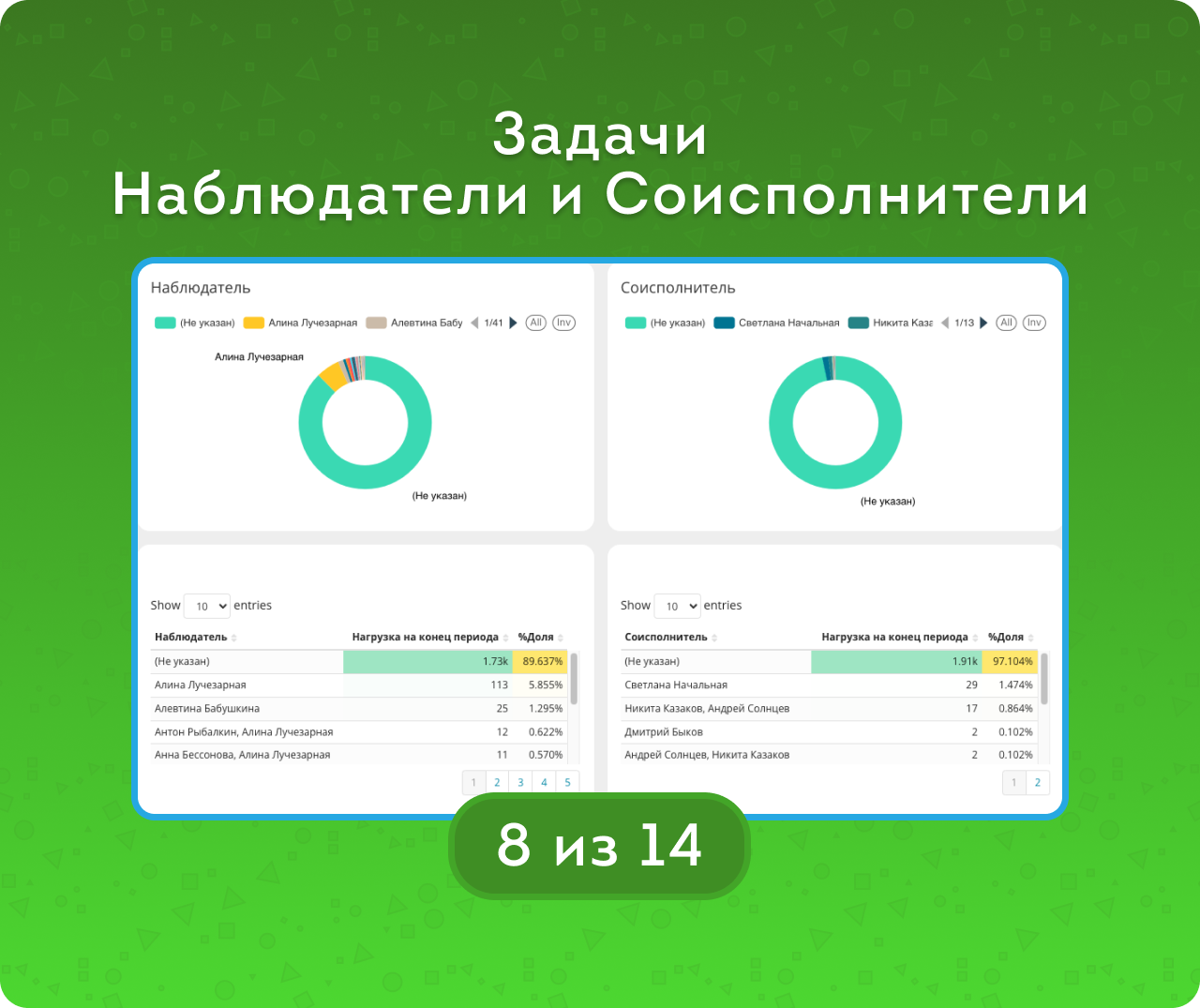 Круговые диаграммы помогают быстро оценить влияние разных факторов на ситуацию: Постановщик, Исполнитель, Соисполнитель, Наблюдатель, Статус, Группа, Приоритет, Тег. Каждый параметр ранжируется в таблице от большего к меньшему, формируя наглядный «рейтинг влияния».