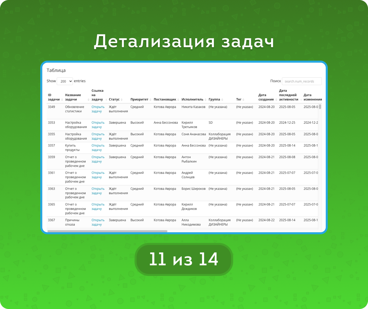 Для более глубокого анализа в отчете представлена таблица с полным списком задач. Она позволяет сортировать данные по полям задач, быстро находить нужные строки с помощью поиска, а также переходить по активным ссылкам в сами задачи.