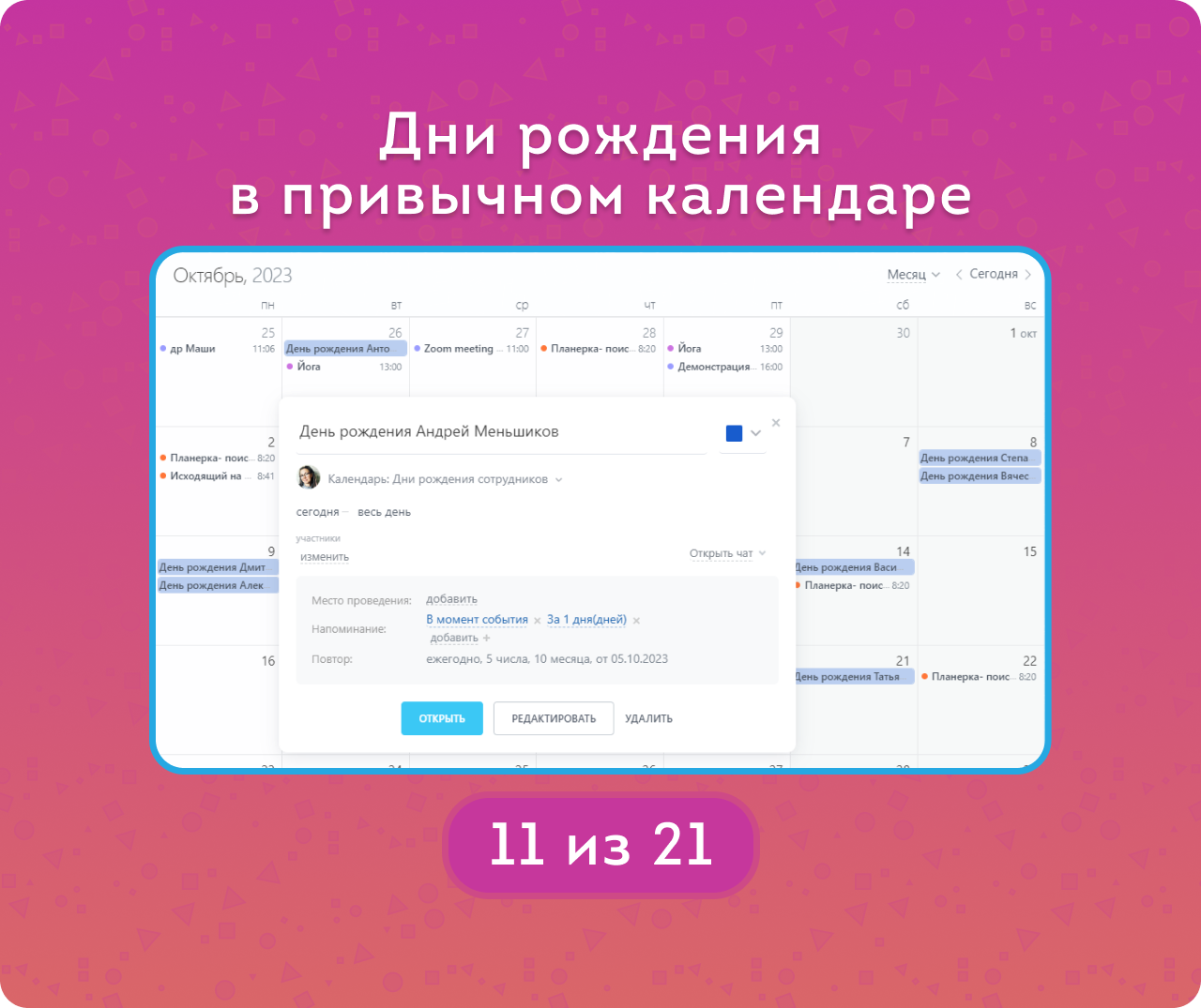 Календарь и напоминания о днях рождения коллег