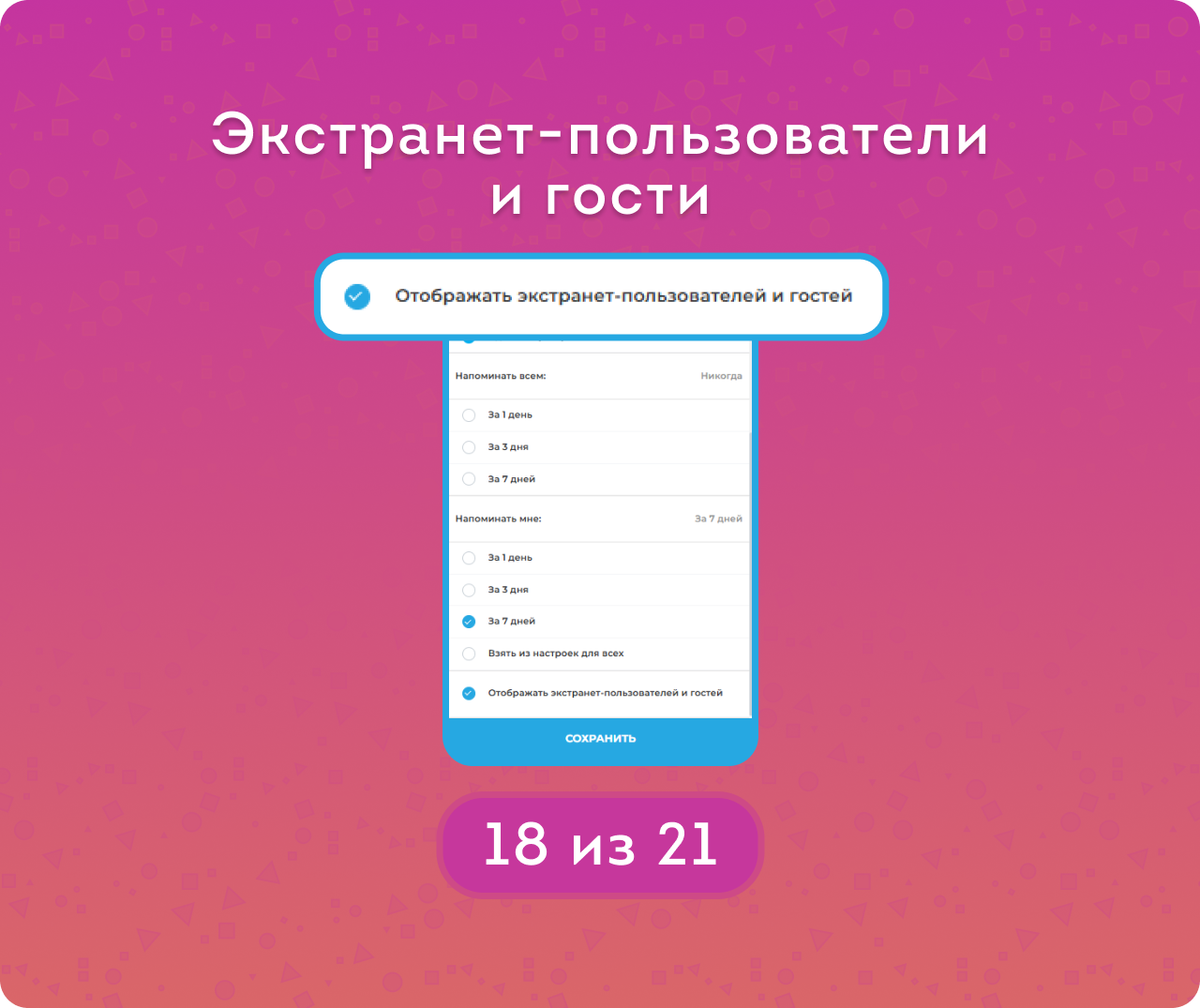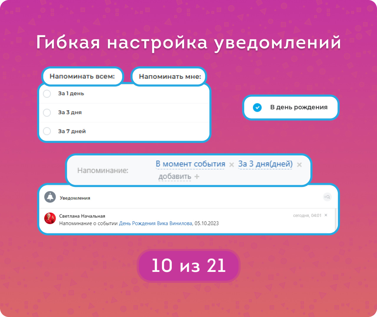 Пример использования: если выбрать «администраторы» и «за 3 дня», то все сотрудники будут получать напоминания за 3 дня до события и не смогут изменить эти настройки. Администратор же сможет настроить напоминания для себя отдельно — например, совсем их отключить или выбрать другую периодичность.