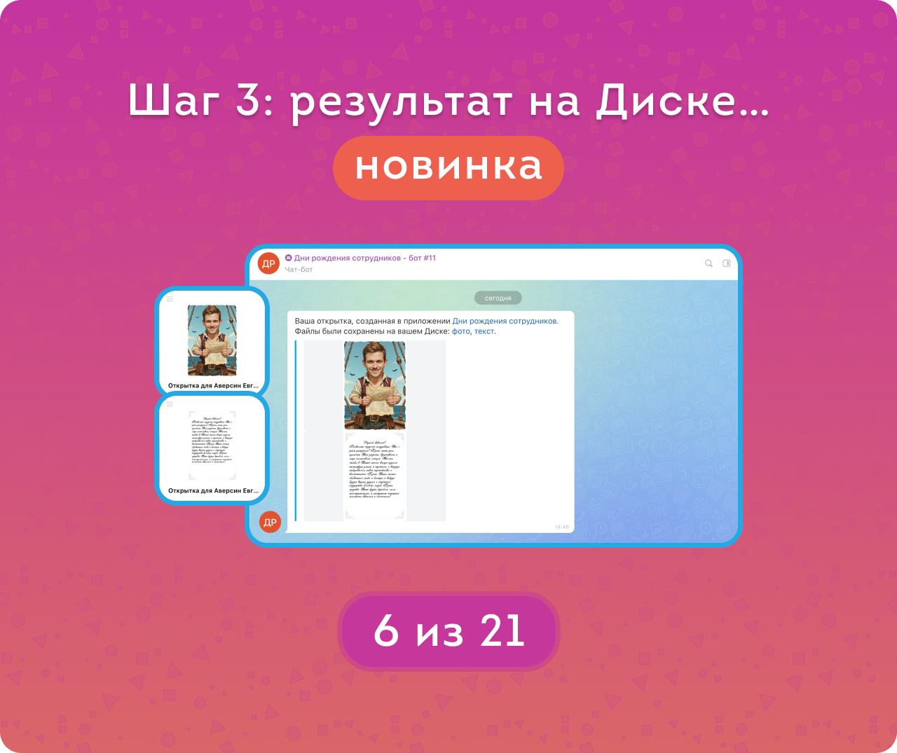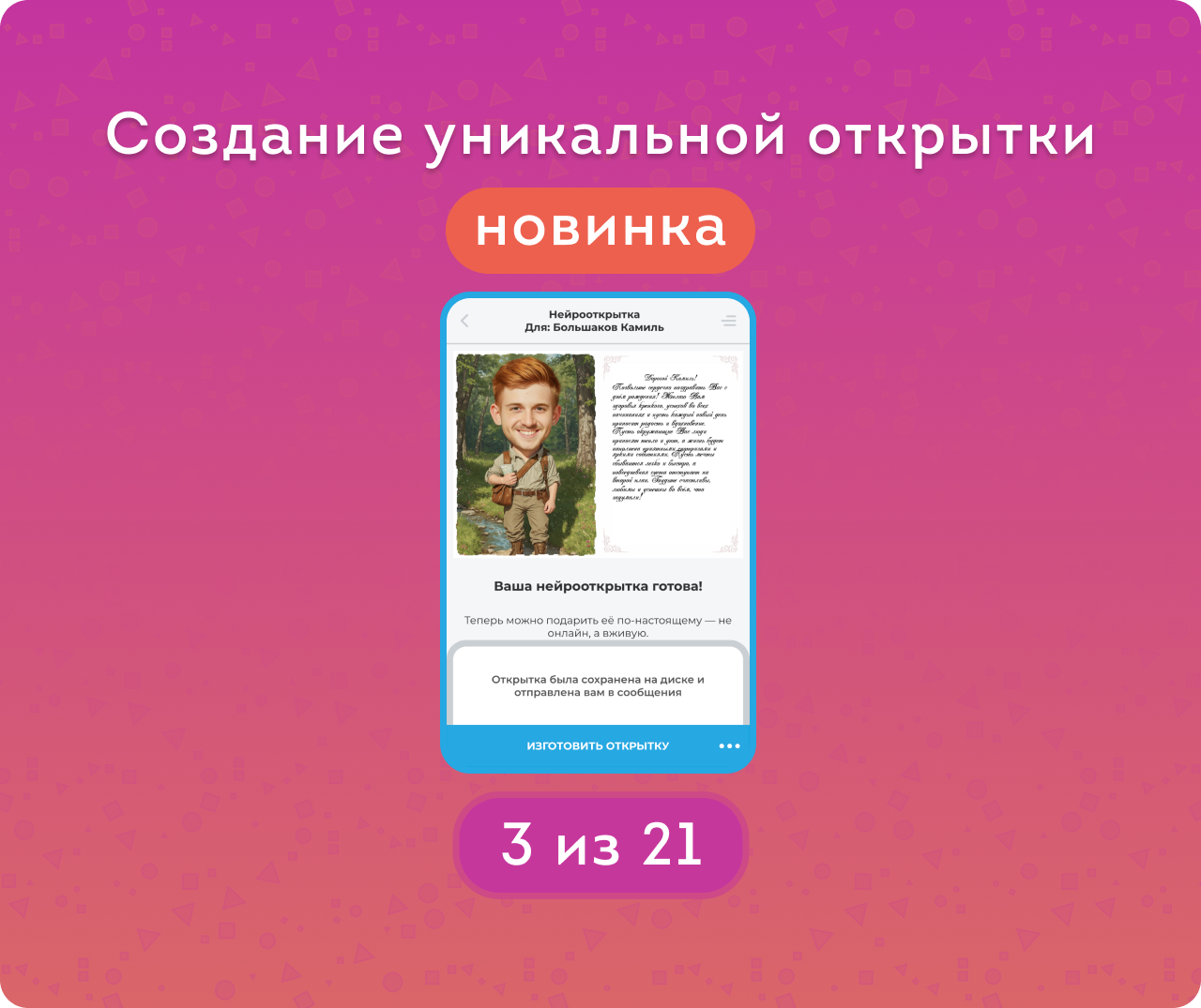 Открытка готова! Её можно сохранить на Диск (и чат-бот приложения пришлет ссылку на файлы), а можно — заказать изготовление и доставку бумажной открытки, чтобы поздравление стало по-настоящему особенным