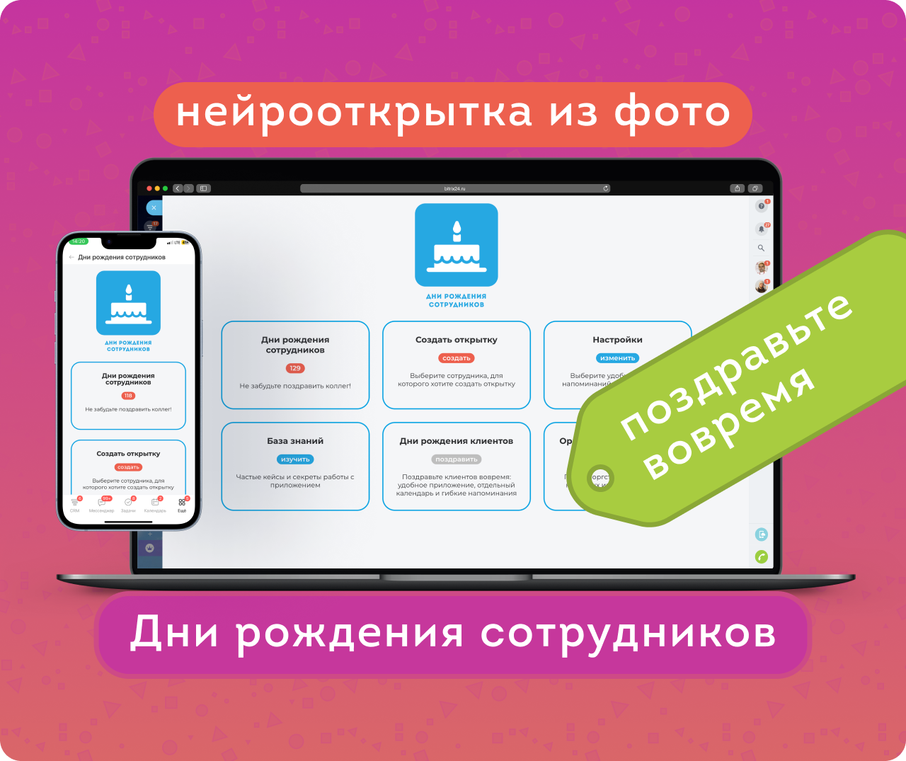 В стандартном виджете Битрикс24 видно только 4 ближайших именинника. Дни рождения сотрудников покажут все дни рождения на год вперед. Также вы увидите общее количество на каждый месяц и сможете одним кликом создать чат или пост в ленте Новостей для обсуждения поздравления (там будут все, кроме именинника). Кроме того, теперь можно создать уникальную нейрооткрытку (NEW) — современный и креативный способ поздравить коллегу.