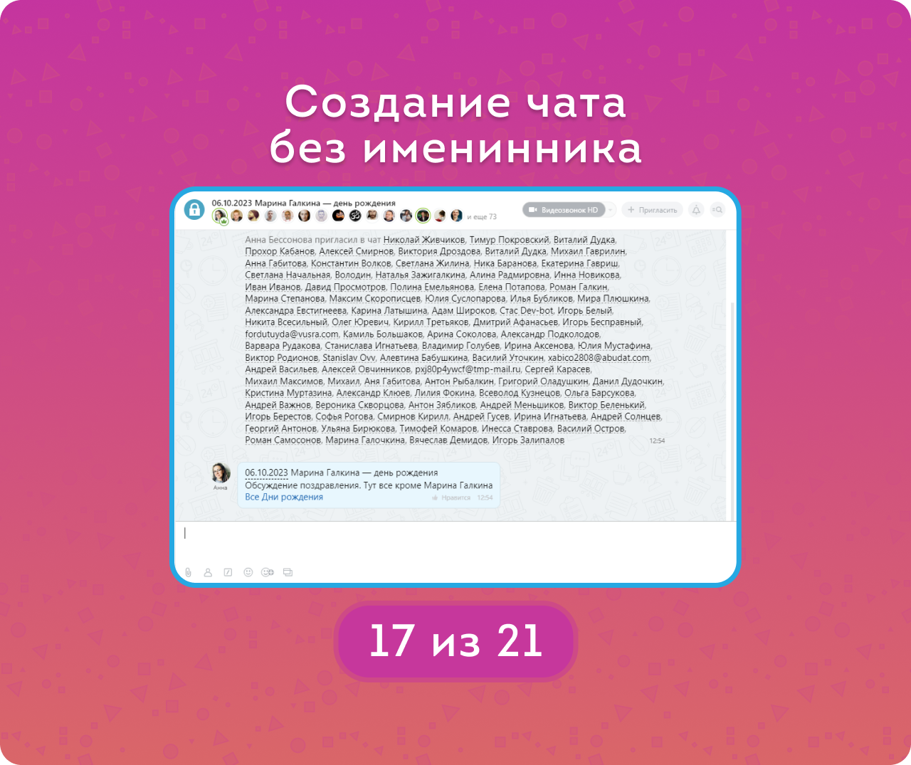 Иначе итак Битрикс перегружен потоками сообщений, а тут ещё представьте себе за год: 150 "веерных сообщений всем кроме именинника" о дне рождении, х (умножить) 90% отказов/"выходов из чата" от этих же 150 человек... = 150*150*0,9=20250 (более 20 тыс.!!! лишних спам-сообщений, которые отвлекают от основной работы). А если компания больше?