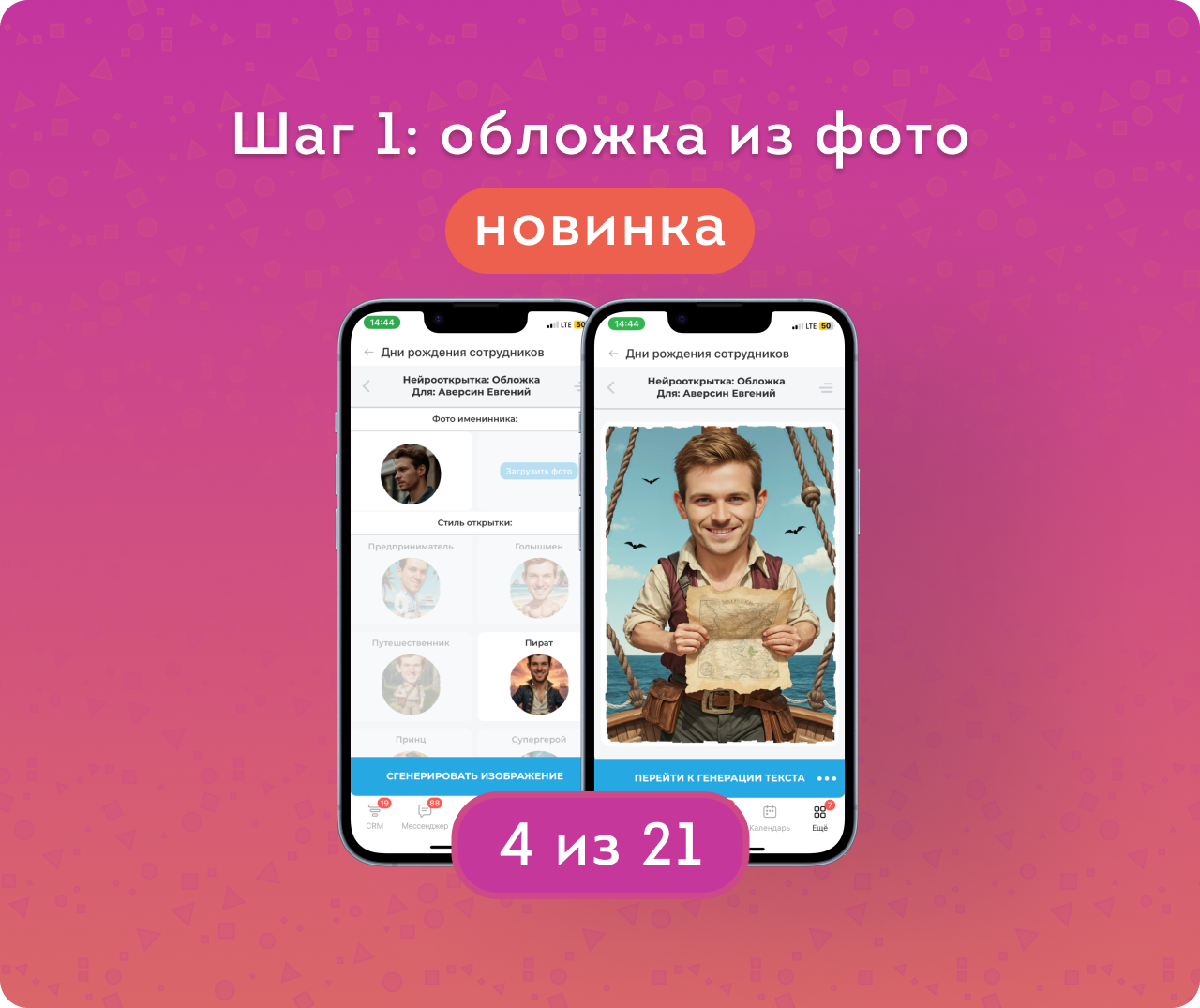 Создавайте необычные поздравления за пару минут! Для этого нужно выбрать фотографию — из профиля сотрудника или загрузив файл, и один из шести стилей оформления. После этого сформируется обложка, а к ней нужно добавить текст поздравления: вручную или с помощью нейросети. Если результат не понравится — всегда можно изменить как обложку, так и текст.