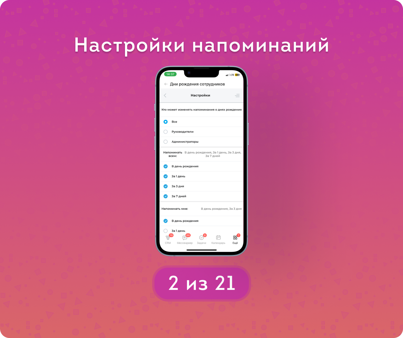 Для того, чтобы заранее подготовиться, и ни о ком не забыть – используйте напоминания. Настройки напоминаний находятся на отдельном экране.