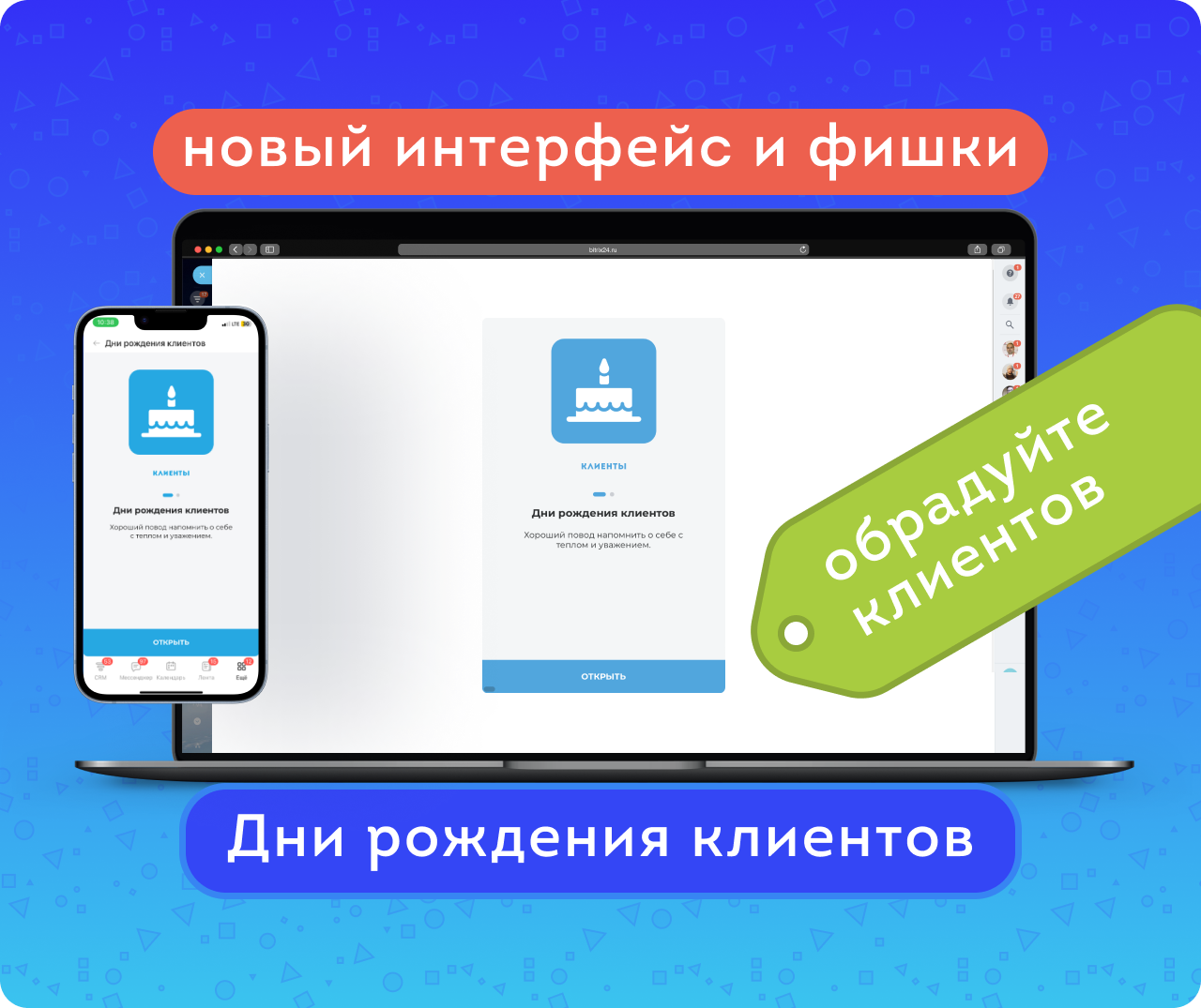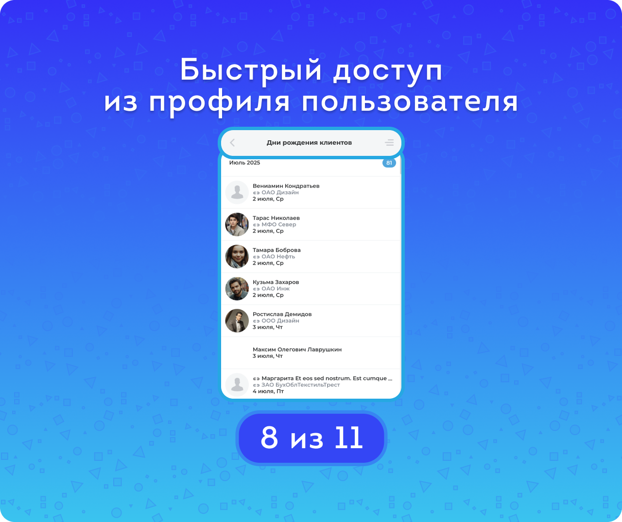 - Настройка отображения: возможность выбрать, чьи дни рождения отображать в приложении: всех клиентов или только «своих» — тех, за кого сотрудник назначен ответственным. Эта настройка индивидуальна для каждого пользователя и влияет только на отображение данных. Важно: уведомления при этом приходят по всем доступным контактам — в соответствии с правами доступа, независимо от выбранного режима отображения.