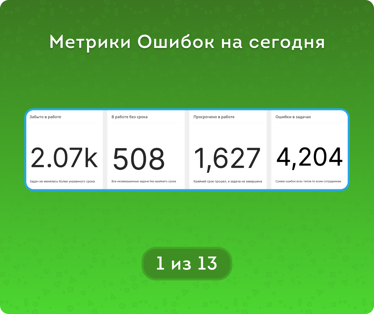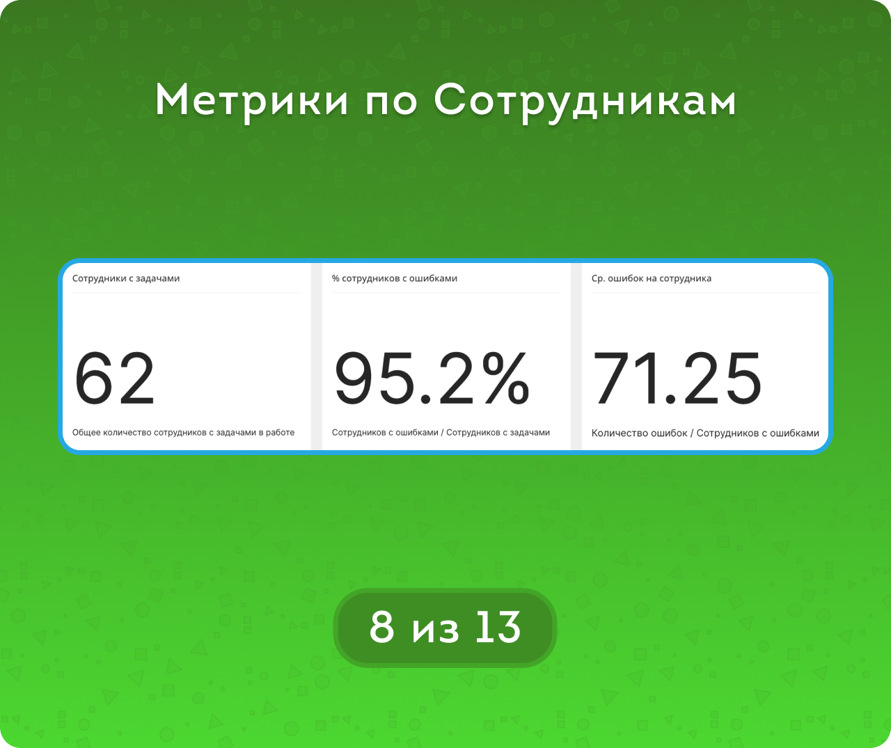 % сотрудников с ошибками – доля сотрудников с ошибками в задачах относительно общего числа сотрудников с задачами.