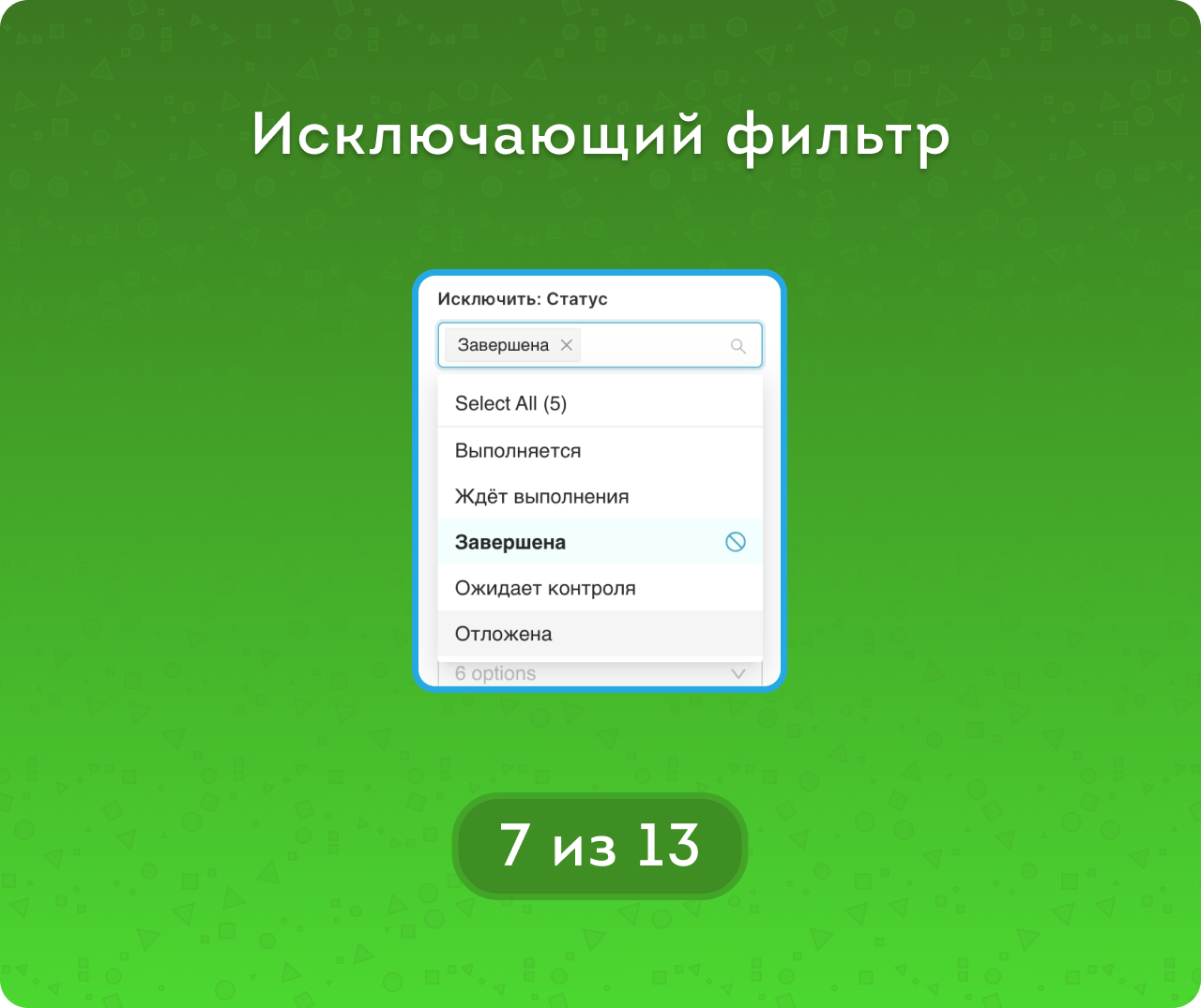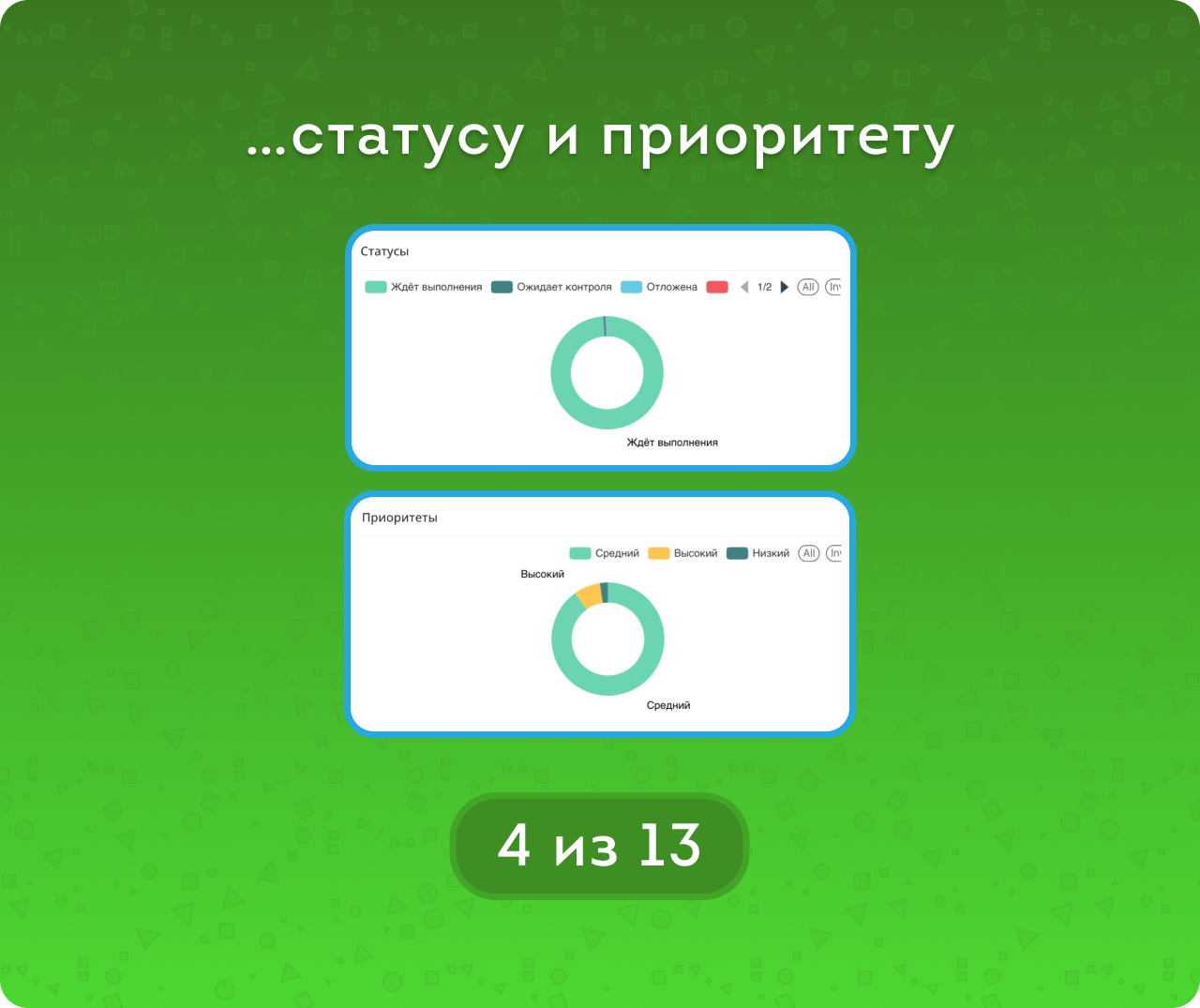 Для уточнения данных можно воспользоваться фильтрами: по исполнителю, постановщику, проекту, статусу задач и тегам. Фильтры гибкие — можно выбрать сразу несколько значений, чтобы получить более точную картину. Кроме того, исключающие фильтры помогут сузить выборку данных, позволяя сосредоточиться на самом важном.
