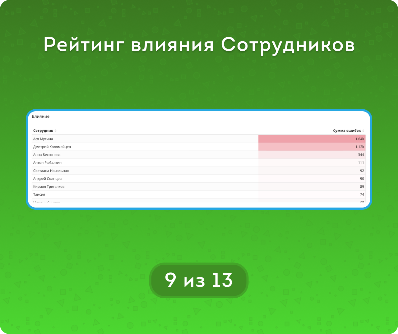 Таблица «Влияние» ранжирует сотрудников с ошибками – от большего к меньшему. Визуализация выполнена в градиенте: сотрудники с наибольшим числом ошибок выделены ярче. Анализ этих показателей позволяет выявить сотрудников с перегрузкой, низким качеством работы и определить проблемы в процессе постановки задач.