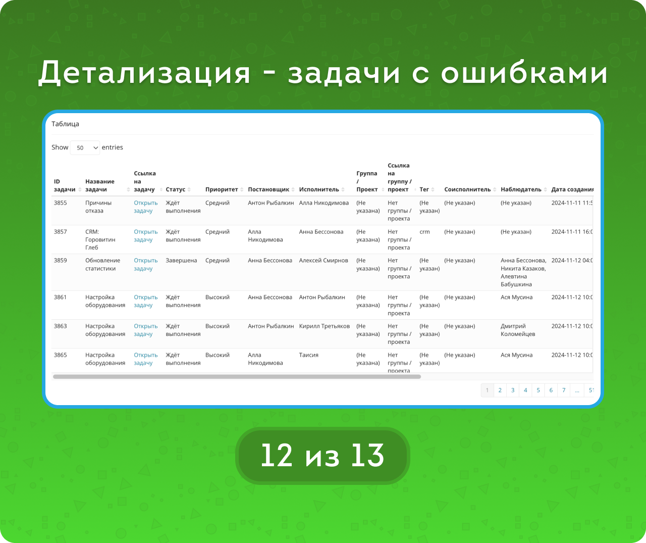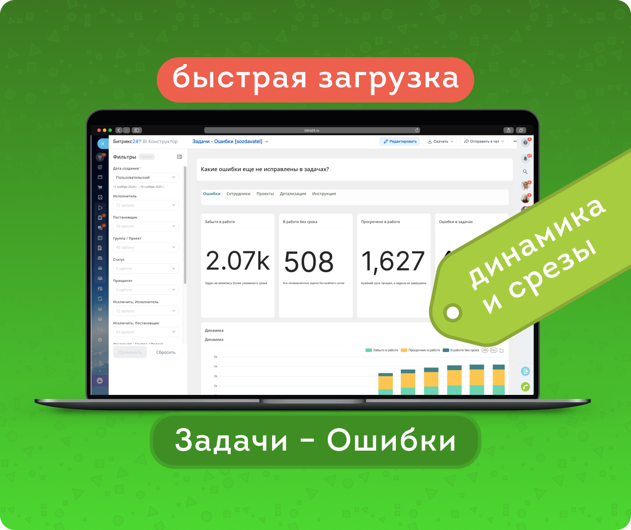 Задачи – Ошибки — инструмент для анализа и контроля качества выполнения задач. Выявляет проблемные места: просрочки, забытые задачи, отсутствие дедлайнов. Незаменим для контроля качества работы и исправления системных сбоев.