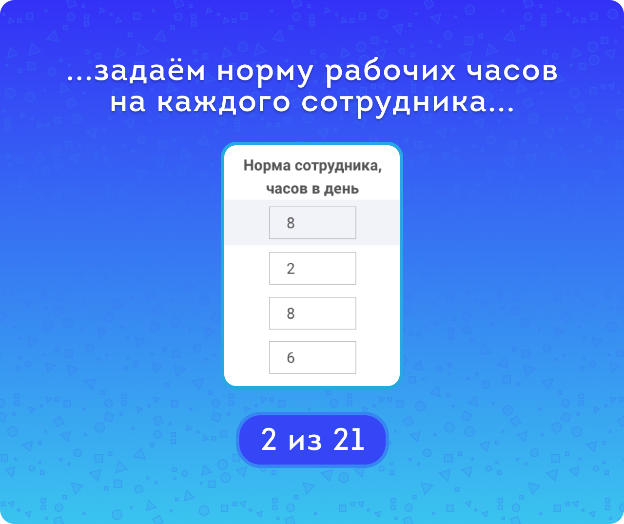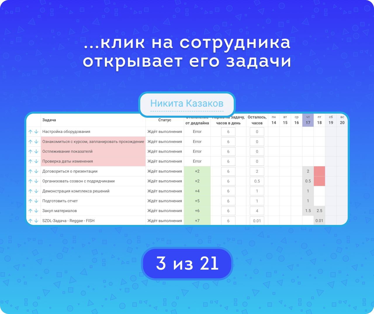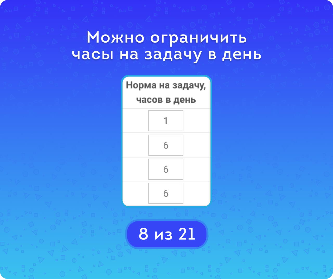 Норма часов в день берётся из общей таблицы, её можно изменить. Это позволяет распределить задачи по дням так, чтобы суммарная нагрузка не превышала установленную норму. Например, руководитель может запланировать 2 часа на одну задачу и 3 часа на другую, чтобы сотрудник выполнял их по очереди в течение дня.